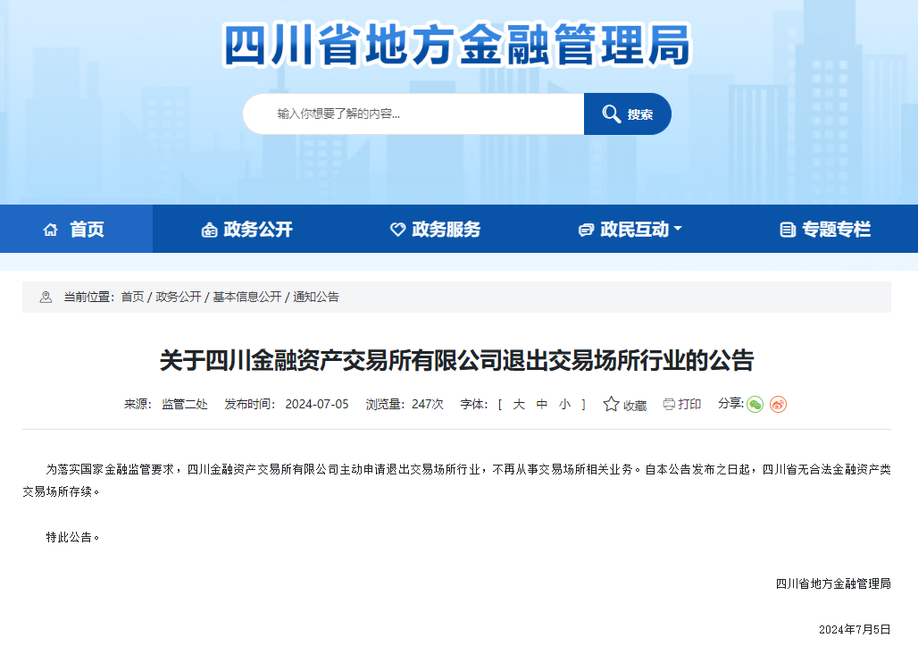 【大河财立方消息】7月8日消息,四川省地方金融管理局日前公告,为落实国家金融监管要求,四川金融资产交易所有限公司主动申请退出交易场所行业,不再从事交易场所相关业务。自本公告发布之日起,四川省无合法金融资产类交易场所存续。