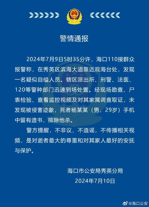 海口警方通报29岁男子疑似自缢身亡:手机中留有遗书 排除他杀