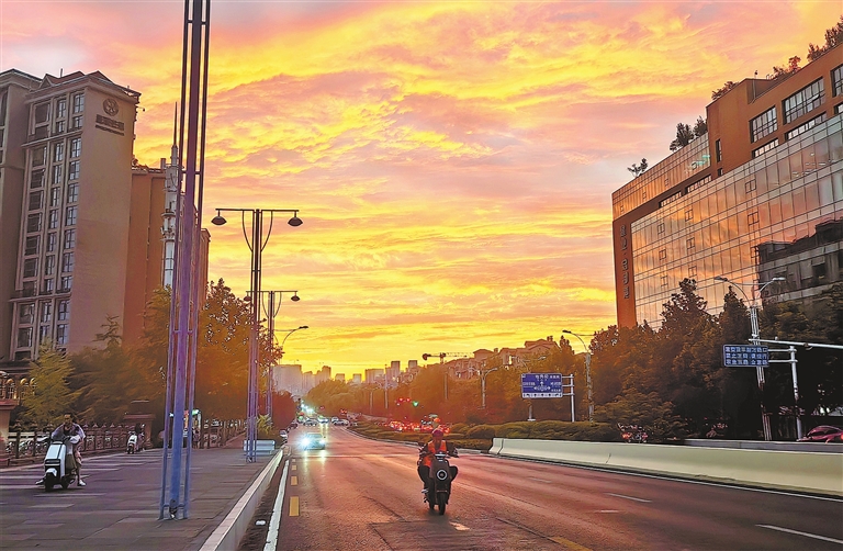 8月28日傍晚,落日熔金,火烧云红透郑州半边天。 河南日报社全媒体记者 白周峰 摄
