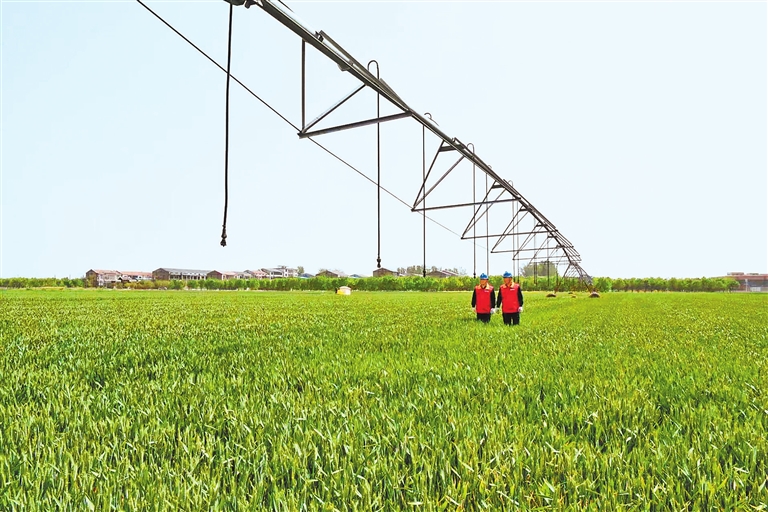 国网河南电力积极主动与省农业农村厅对接,实现电力基础设施与中原农谷高标准农田示范区建设同步规划、同步设计、同步实施。今年累计为中原农谷高标准农田示范区新建10千伏线路117.45千米,配套建设配电变压器374台,总容量达4.14万千伏安,机井14500眼,实现了“井井通电、表表计量”。