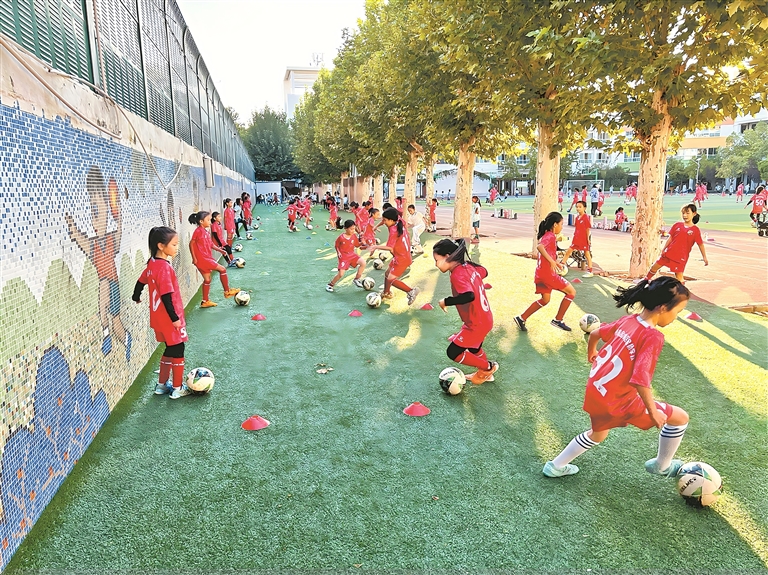 金桥学校的女足成绩令人瞩目:2022年以来,在“省长杯”中拿过三个冠军、一个亚军,更包揽了2019年以来的历届郑州市“市长杯”冠军。“学校从2011年开始发展校园足球。”李欣介绍,每天上午10点到10点30分、下午4点10分到4点40分,校园里都会上演“足球大课间”。