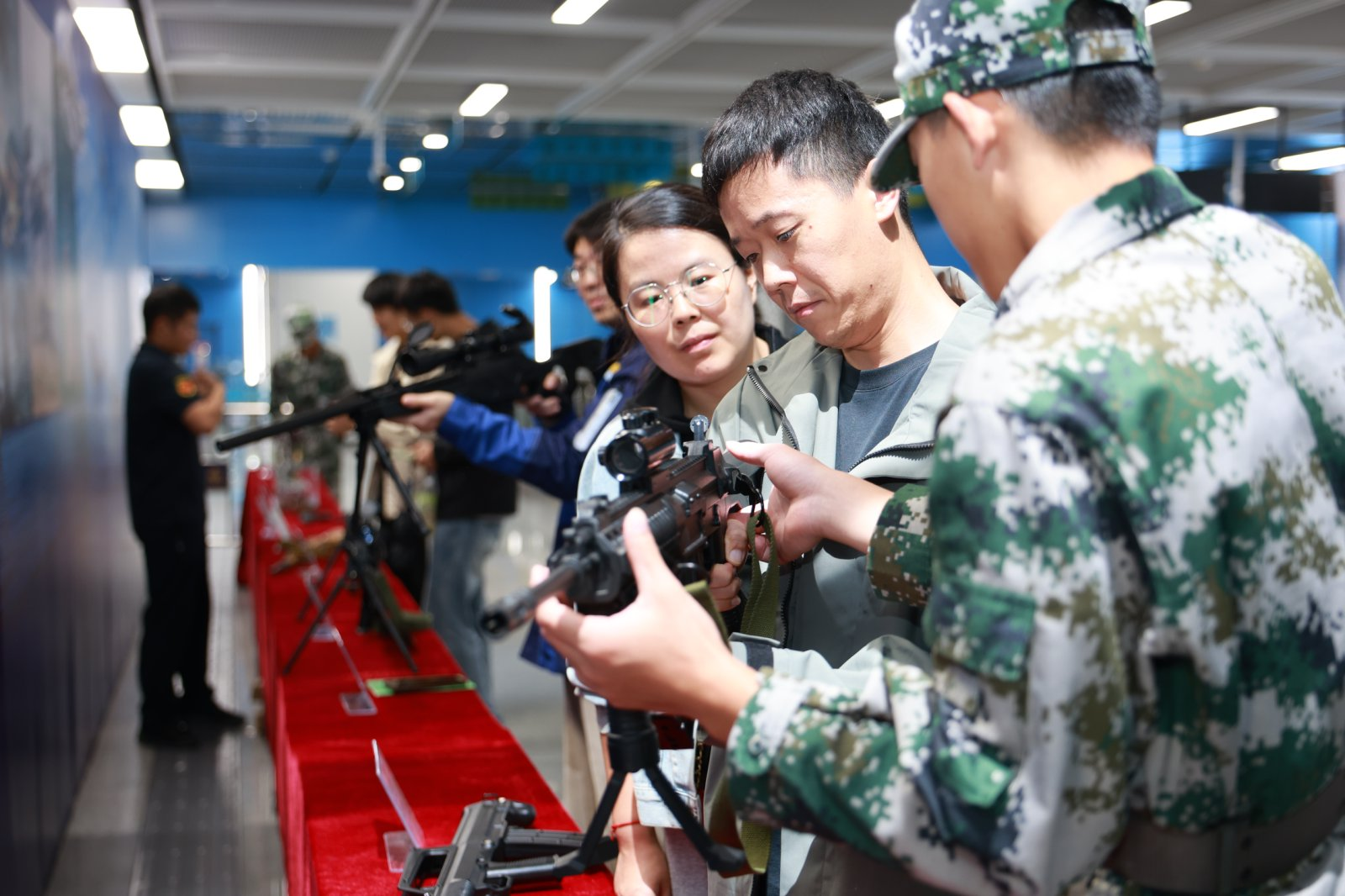 在会展中心站“装备特训区”,大三学生小陈在模拟射击设备前排队,初次尝试射击体验的他向记者分享了他的感受,“碰到扳机的那一刻,我突然理解了什么叫‘战位’。”