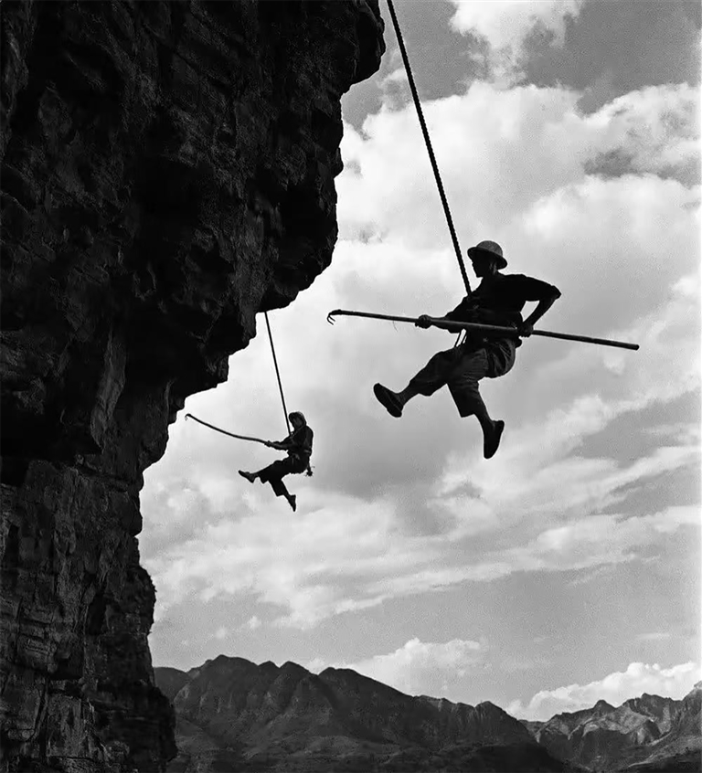 1961年,红旗渠建设中,排险队员腰系绳索,荡在空中,消除绝壁上的险石。魏德忠 摄