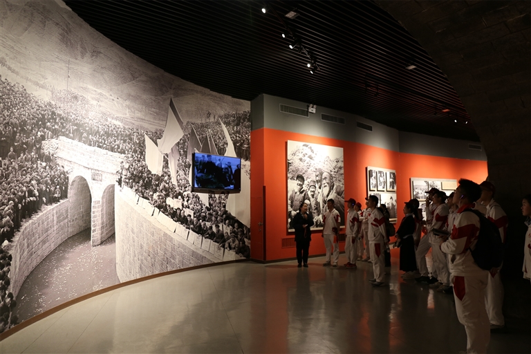 青少年在参观红旗渠纪念馆。红旗渠风景区供图