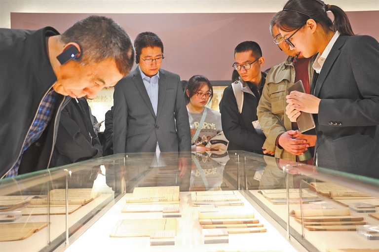 与会专家学者参观老子《道德经》书籍展。 刘俊涛 摄