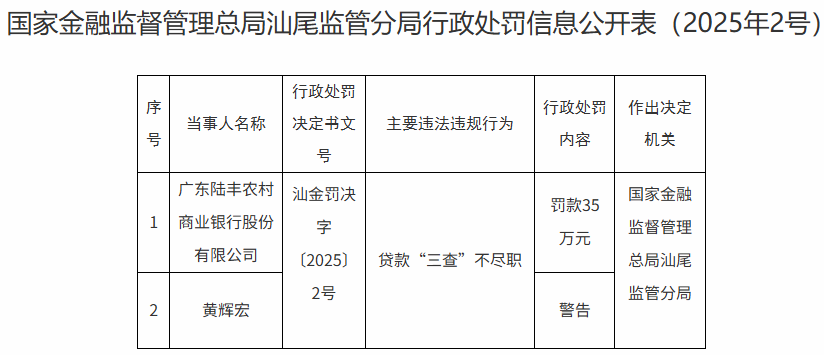 【大河财立方消息】11月13日,国家金融监督管理总局汕尾监管分局披露的行政处罚信息公开表显示,因贷款“三查”不尽职,广东陆丰农村商业银行股份有限公司被罚35万元。
