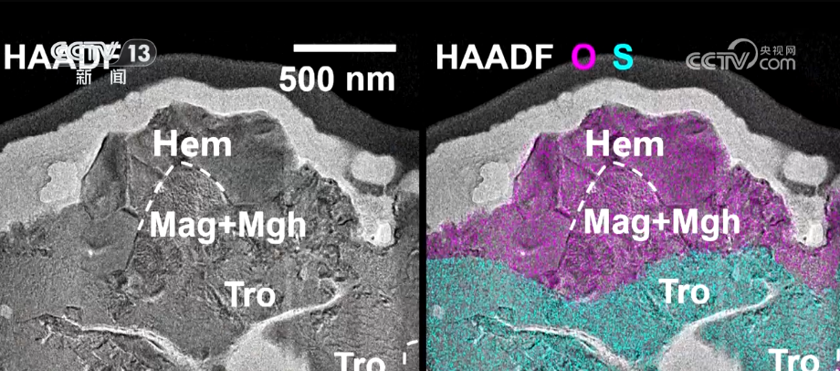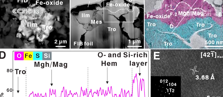 山东大学空间科学与技术学院副院长凌宗成介绍,他们在数千条月壤光谱数据当中找到了赤铁矿的线索,利用电镜微区分析等手段对于矿物的晶体结构和矿物种类进行了识别。最终在嫦娥六号月壤样品当中,首次发现了赤铁矿和磁赤铁矿两种矿物,这是月球氧化作用研究的重大科学突破。