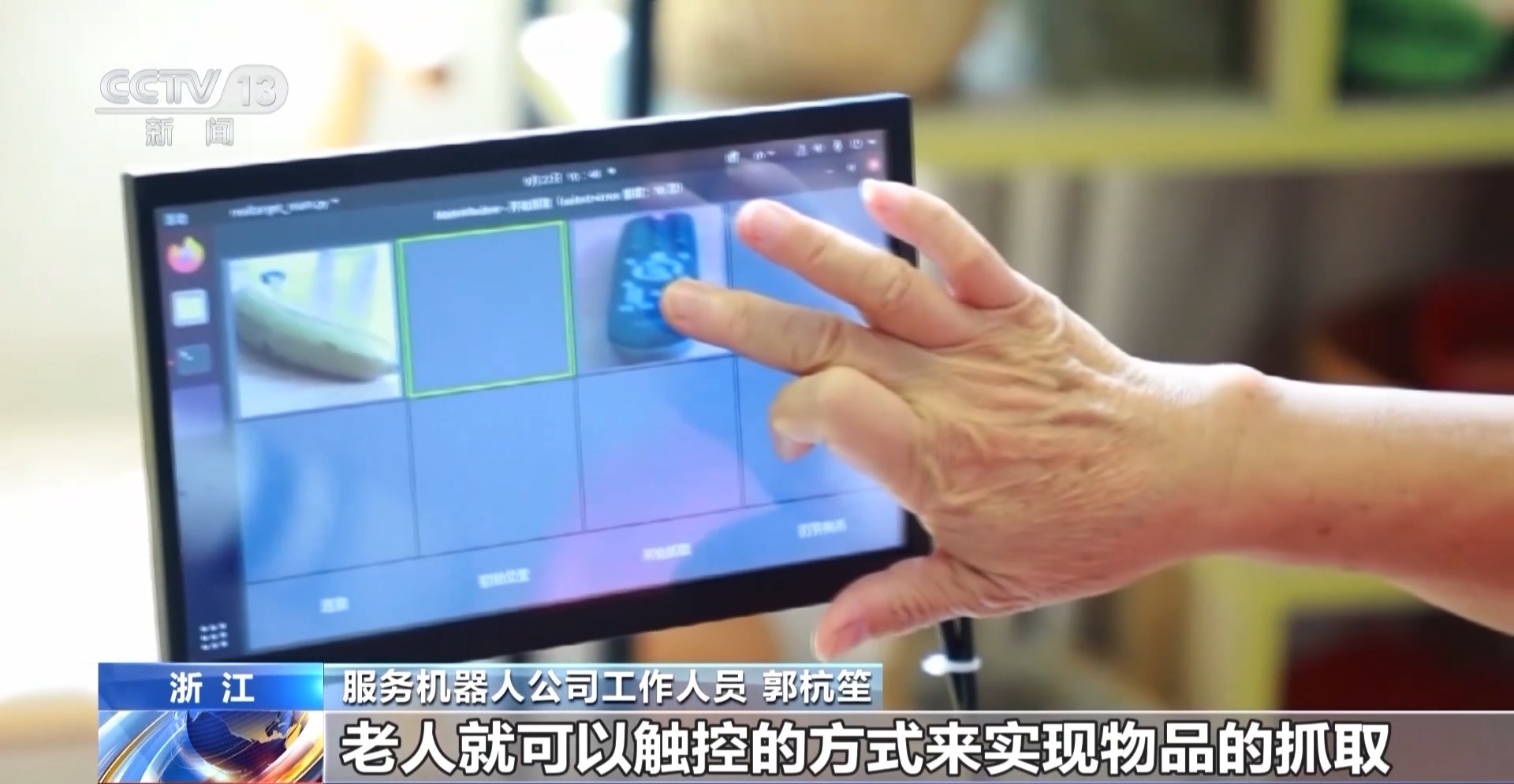 服务机器人公司工作人员郭杭笙:前前后后进行了11次的迭代升级,我们还搭配了屏幕,老人就可以用触控的方式来实现对物品的抓取。
