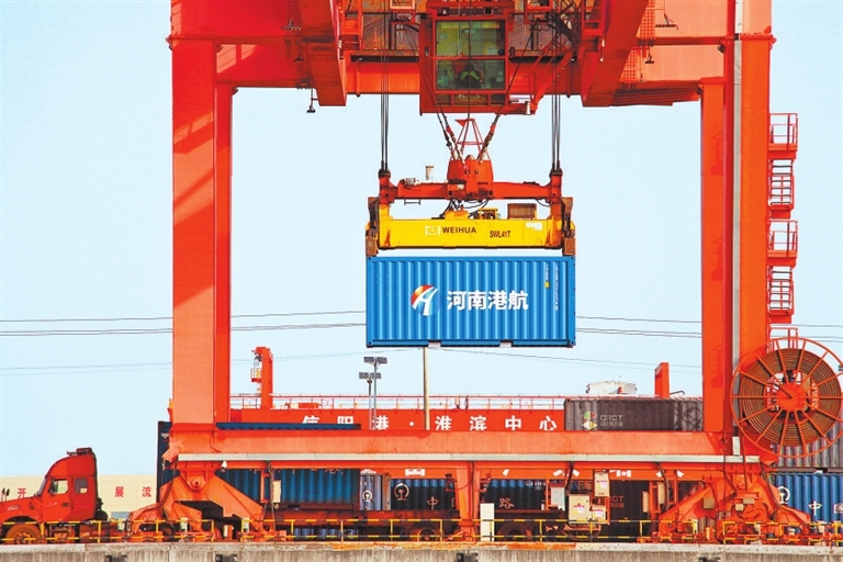 图② 信阳港·淮滨中心港区,起重机在装运集装箱。 王长江 摄