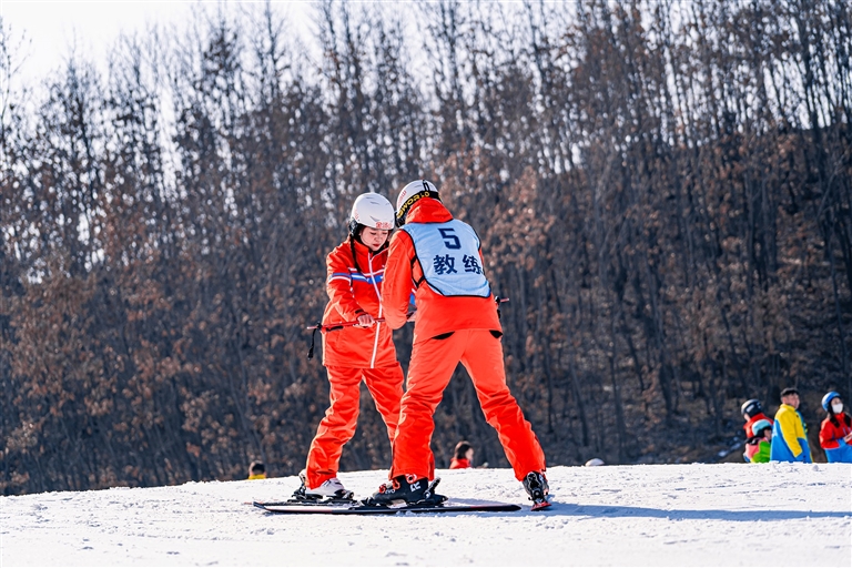 位于鲁山县瓦屋镇的金汤山滑雪场上,教练在悉心指导游客滑雪。