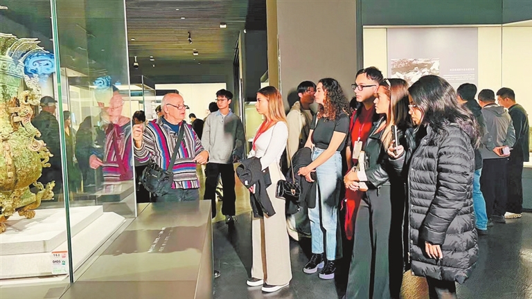 盖瑞教授在河南博物院为外国友人讲解中国文物。