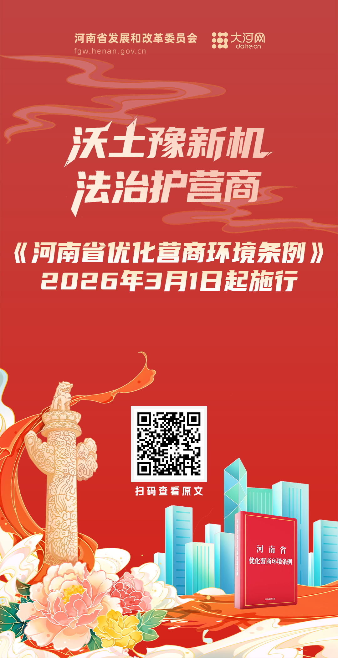 3月1日起,这部满载着经营主体期盼的《条例》将正式施行。从“拆门槛”到“优服务”,从“强监管”到“重监督”,河南正以法治化营商环境的确定性对抗市场环境的不确定性,为各类经营主体在豫投资兴业、融入服务全国统一大市场打造一个稳定、公平、透明、可预期的发展“强磁场”。(李连凡 田佳宁/文 张舒婷/海报)