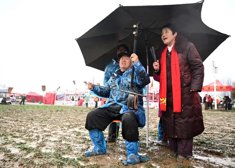 河南省曲艺家协会主席范军穿梭在人群中。望着此景,他说:“地当舞台天作棚,这种原生态没变,但政府对文化的重视变了,麦田里的父老乡亲与艺人融为一体,风雨中就是一幅生动的年画。”