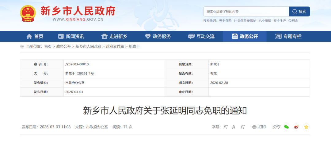 根据中共新乡市委组织部新组干〔2026〕24号文件通知,经研究,决定免去: