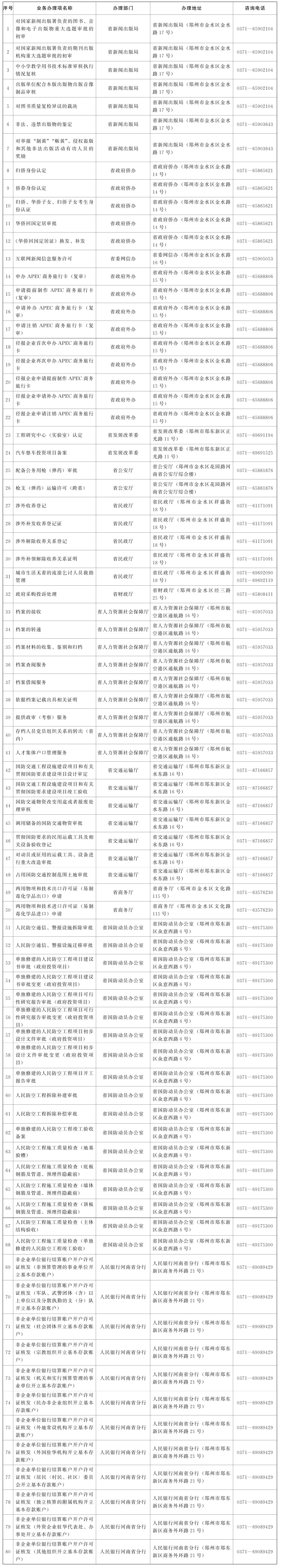 大河网讯 近日,省行政审批政务信息管理局官网公布了《河南省政务服务中心进驻事项负面清单(2025年版)》(以下简称《负面清单》)。《负面清单》明确,省新闻出版局、省政府侨办、省发改委等13个省级部门的80个政务服务事项不进驻省政务服务中心办理。为方便企业群众办事,《负面清单》同时公布了这80个事项的具体办理地址、咨询电话等信息。需办理相关事项的,请按公布信息前往指定地点办理,避免跑空跑错。