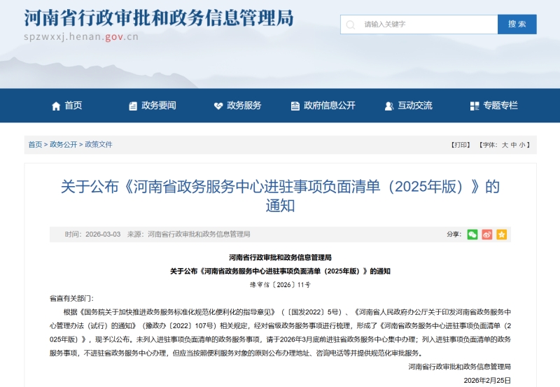 据了解,此次《负面清单》的公布,是落实《国务院关于加快推进政务服务标准化规范化便利化的指导意见》(〔国发2022〕5号)关于建立政务服务中心进驻事项负面清单制度要求的具体举措,同时也严格遵循《河南省政务服务中心管理办法(试行)》(豫政办〔2022〕107号)中“除不宜进驻的事项外,其他省级政务服务事项全部集中进驻省政务服务中心,实现‘应进必进’”的规定。清单所列的80个事项即为经评估不宜进驻省政务服务中心集中办理的事项,而未列入《负面清单》的其他省级政务服务事项,将于2026年3月底前全部进驻省政务服务中心。