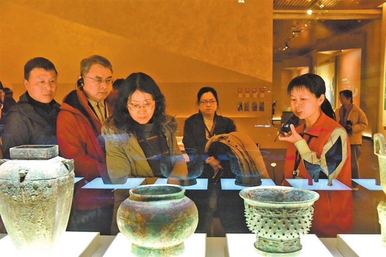 游客在殷墟博物馆参观青铜器。彭捷 摄