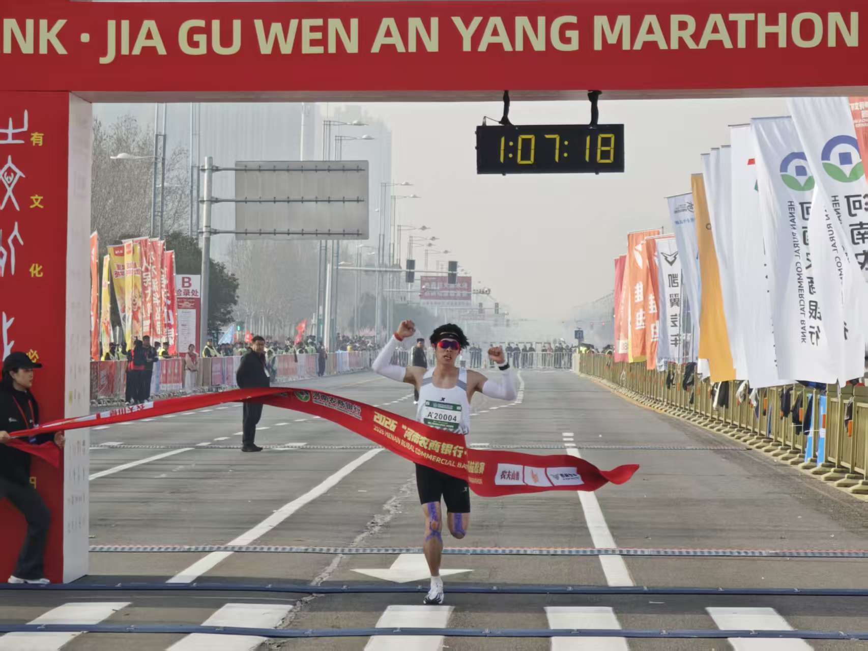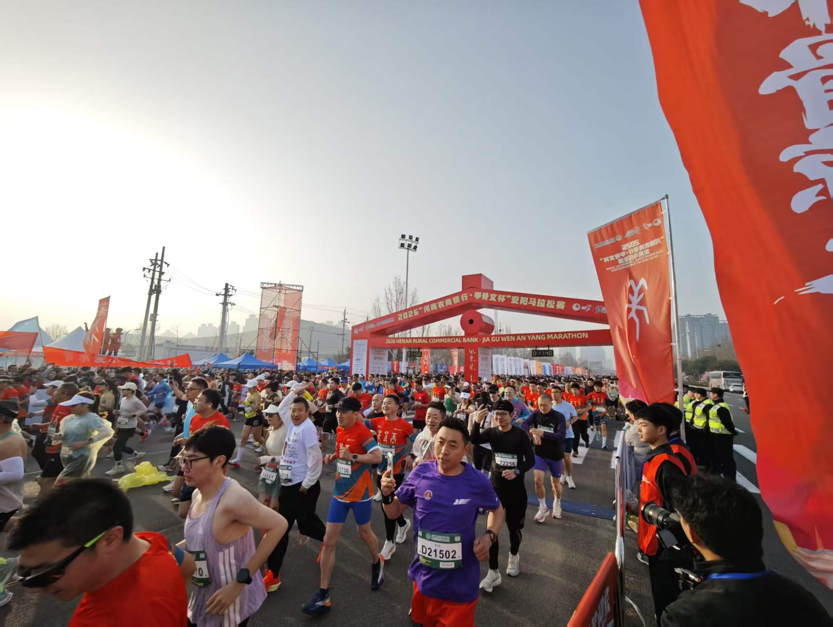 踏入赛场,文化的气息扑面而来。起跑门被设计成甲骨文“字”的样式, 26000名跑者从这扇“字”门下冲出,仿佛从三千年的文明中出发。赛道两旁的旗帜上,甲骨文的“春”“福”等字样随风飘扬,为这场春天的奔跑增添了浓浓的吉祥寓意。