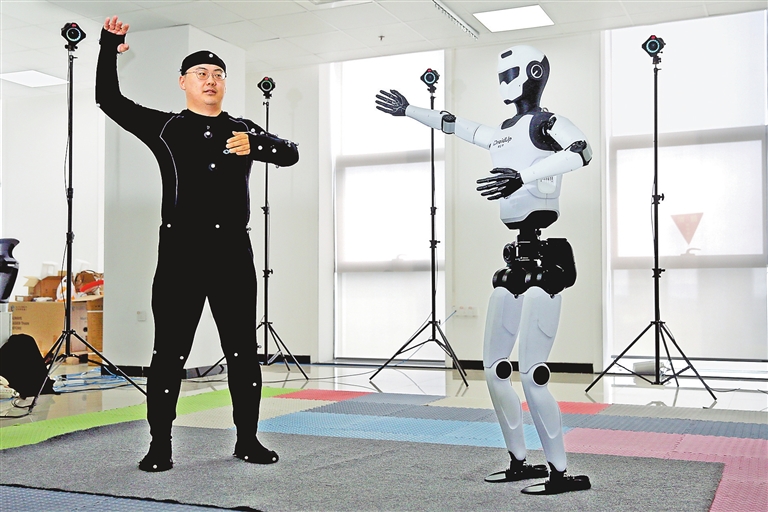 在省科学院中豫具身智能实验室,动作捕捉工程师录入相关动作指令,以提高机器人精准度与可控性。