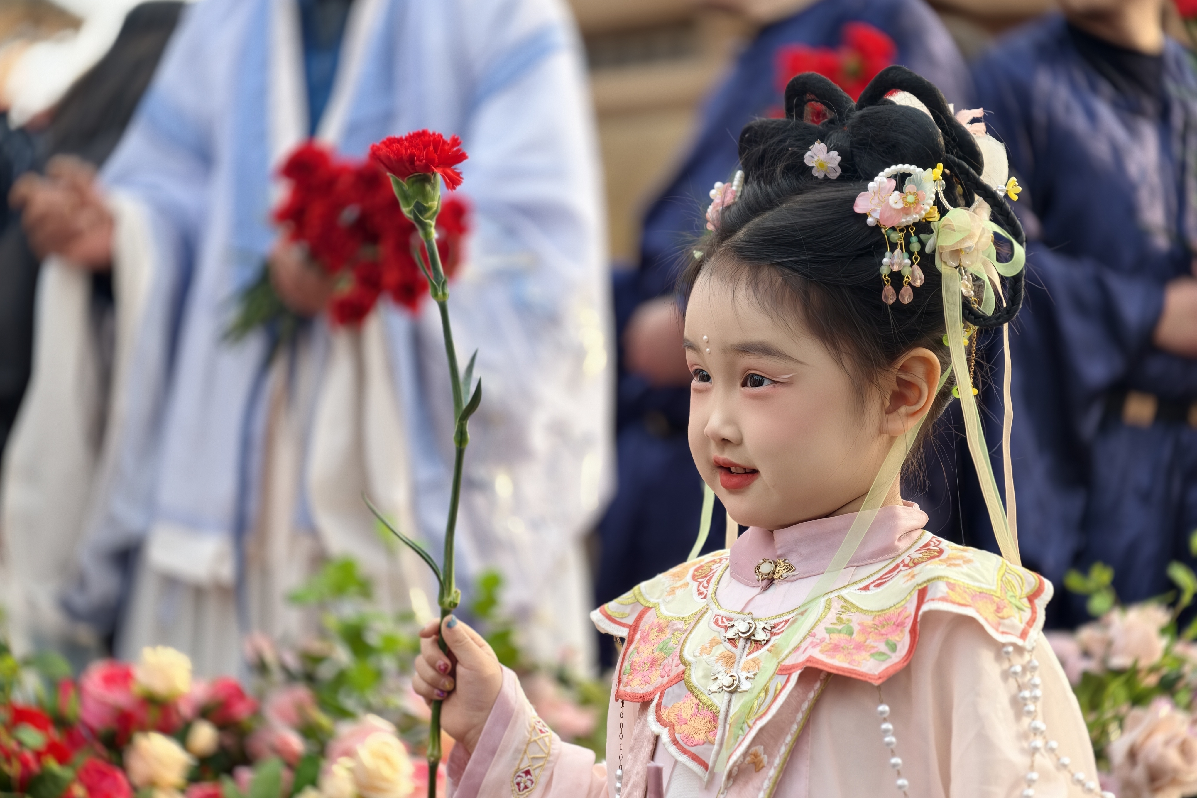 开封清明上河园营销中心市场部经理邢潇月介绍说,北宋时期,男子簪花、女子簪花是一种风尚,园区将这种风俗风雅复原,让游客切身体会到大宋的文化,感受到春天浪漫的氛围。