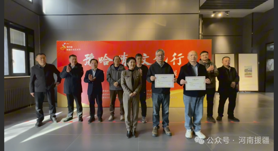 仪式现场还举行了书画作品捐赠仪式,封曙光、张新词两位艺术家向哈密市美术馆捐赠书画作品,哈密市美术馆馆长马晓芬接受捐赠并颁发收藏证书,这份珍贵的艺术馈赠为豫哈文化交流再添浓墨重彩的一笔。最后,林海波宣布“豫哈情 文化行——豫哈美术写生作品展”正式启幕,现场嘉宾共同移步参观展览。