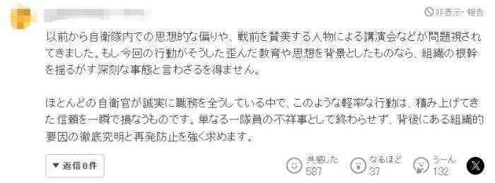 网友称,自卫队内部的意识形态偏见以及某些人宣扬战前时代的言论长期以来备受诟病。如果此次事件源于这种扭曲的教育和意识形态,那将是一个动摇组织根基的严重问题。强烈要求对事件背后的组织因素进行彻底调查,并采取措施防止此类事件再次发生。