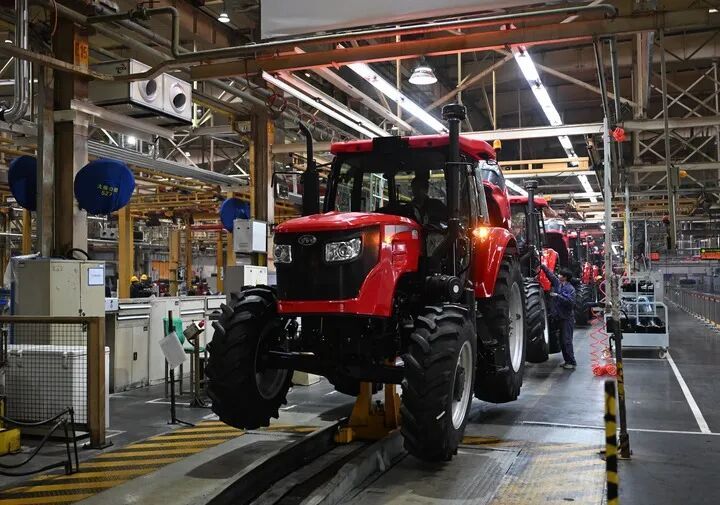 工人在位于河南洛阳的国机集团中国一拖大轮拖总装线作业。新华社记者 李嘉南 摄