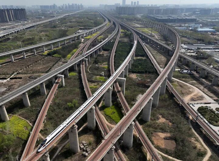 在河南省郑州市拍摄的纵横交错的高铁线路(无人机照片)。新华社记者 李嘉南 摄