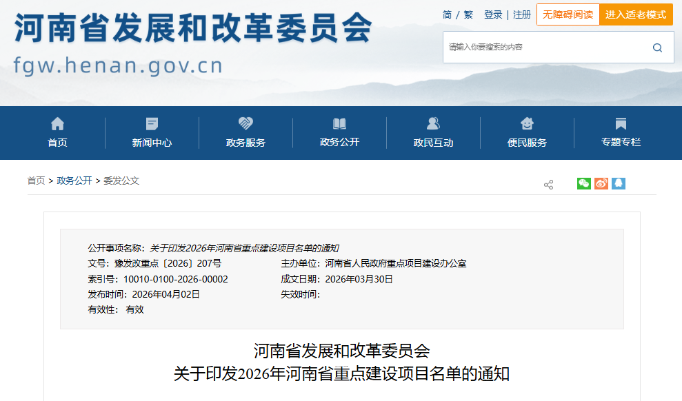 大河网讯 4月2日,记者从省发展改革委获悉,2026年河南省重点建设项目名单正式印发,明确我省2026年省重点项目1418个、总投资约3.2万亿元,力争年度完成投资1万亿元以上。