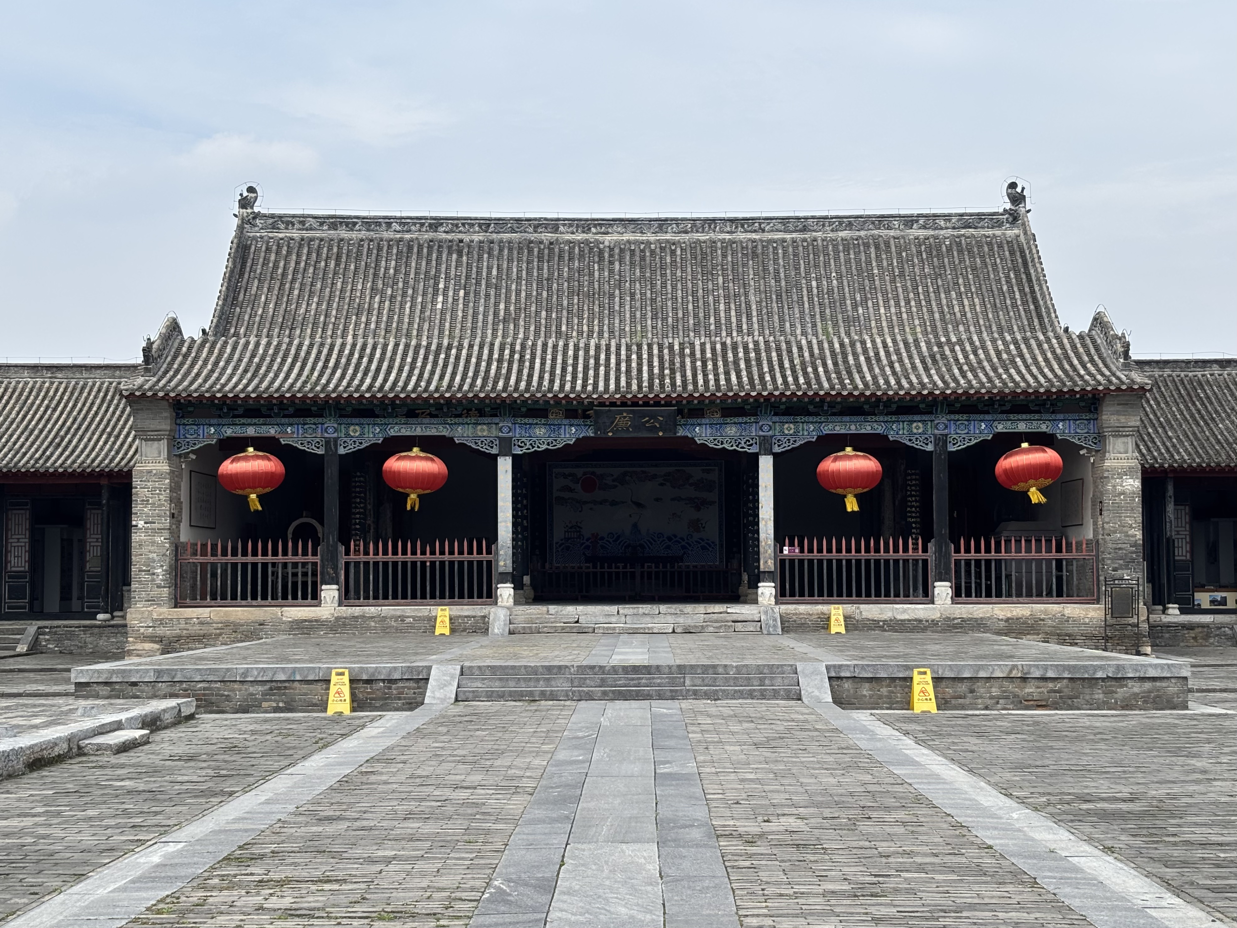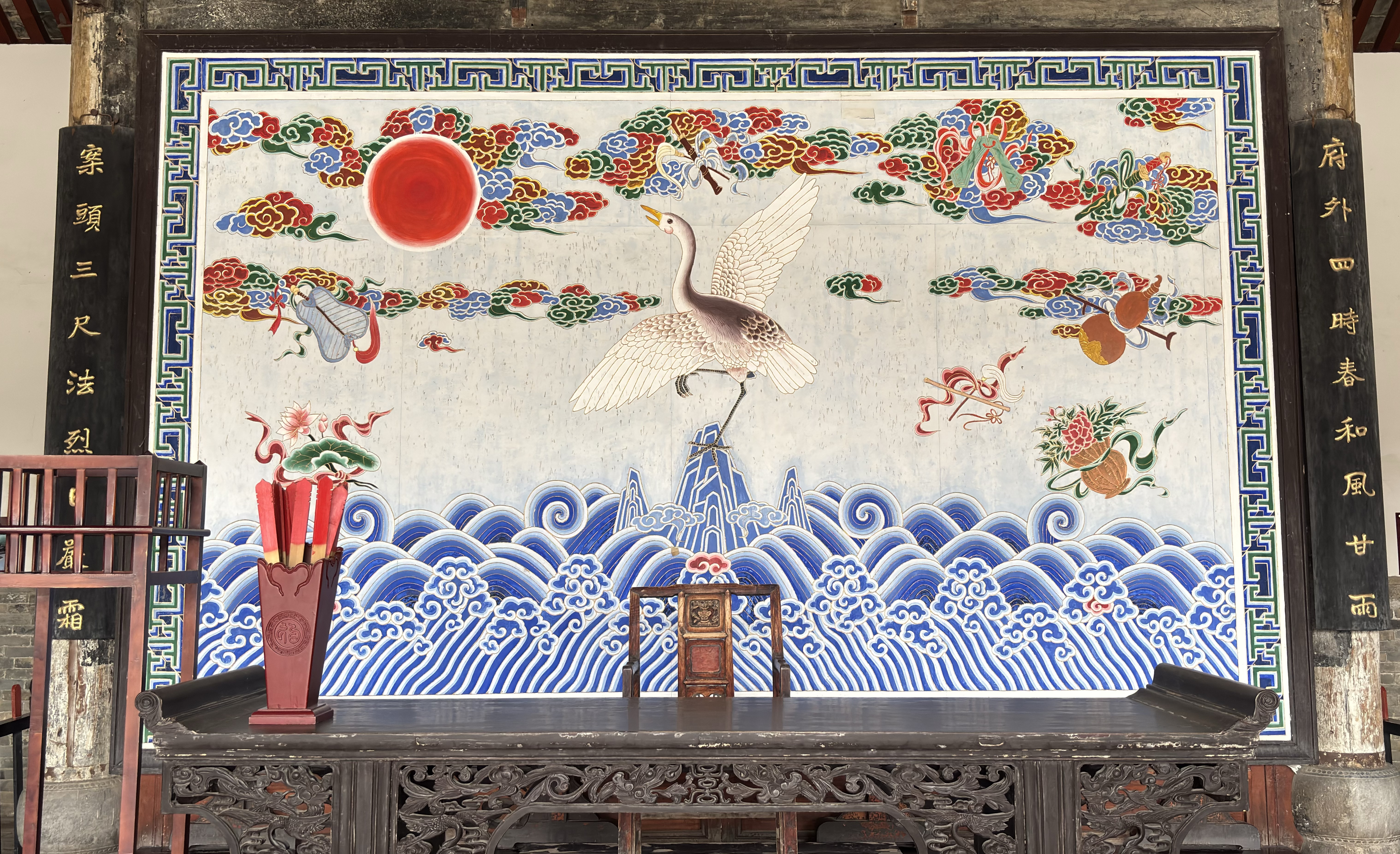 大堂是府衙的核心区域。这座名为“公廉堂”的建筑坐落于1.2米高的青石台基上,堂内高悬的“公廉”匾额,源自“公生明,廉生威”的古训,笔力千钧。堂内的“云雁朝日”图精美吸睛,据讲解员介绍,这幅图寓意官员可以像八仙过海一般各显神通、为民造福。