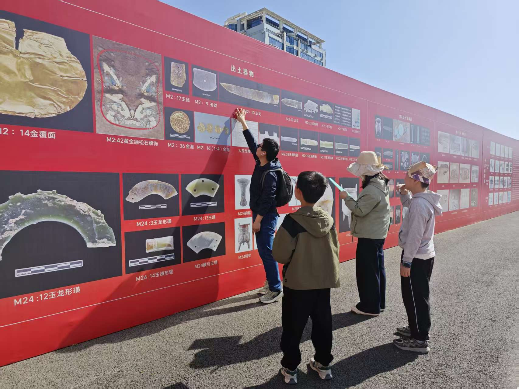 在考古体验区,来自浙江金华的李女士正带着四年级的儿子用小铲子清理土中的碎片。工作人员介绍,这些是真实的文物碎片,因无法修复才用于体验活动。李女士说,这是她第一次带孩子参观室外考古现场,“我本人很喜欢考古,这样的体验很难得”。一旁,来自浙江义乌的一对年轻夫妇也带着两个儿子,对照“宝藏任务书”在展板前寻找答案,父母不时进行讲解。