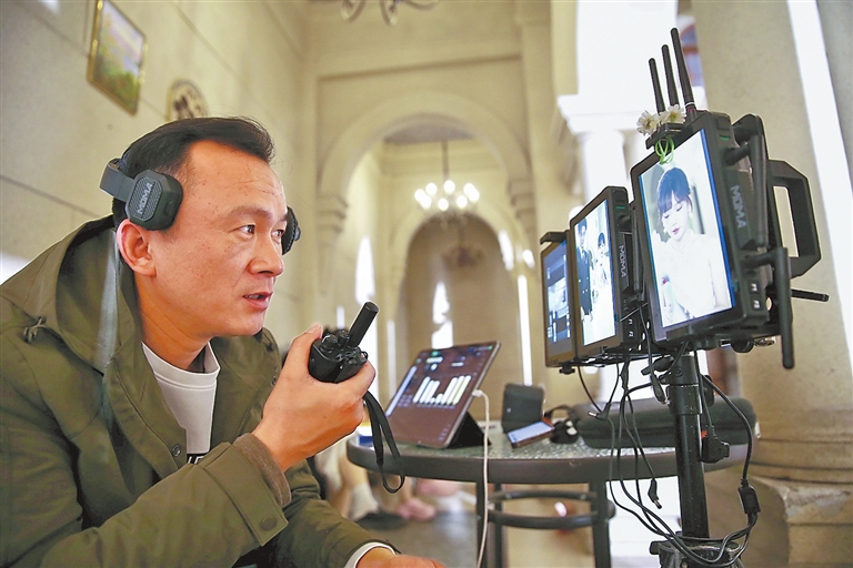 4月8日,郑州市金水区大志影视基地,导演在监视屏前发出讲戏指令。