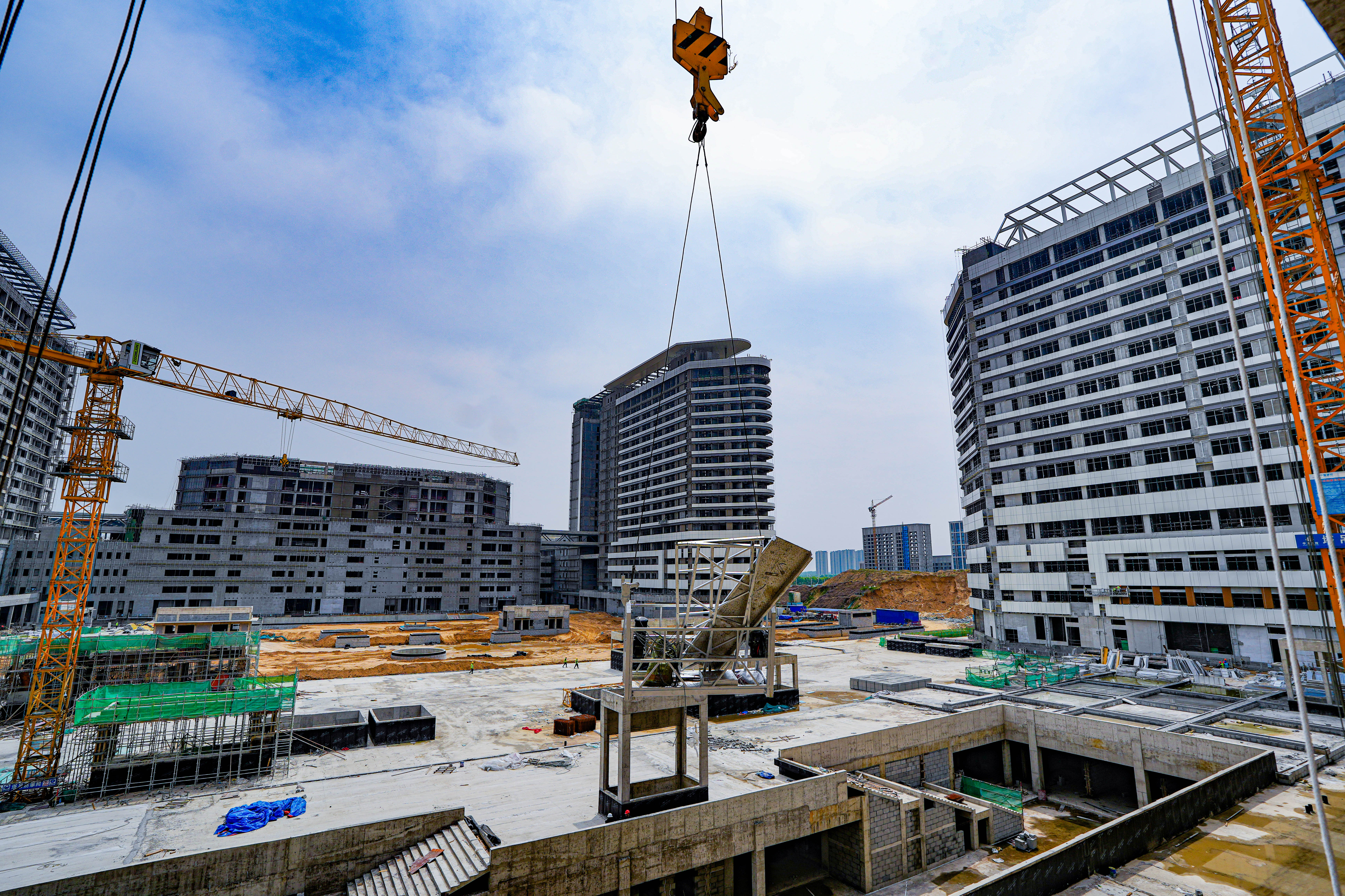 近日,记者走进“两院一中心”项目二期施工现场。眼前,几栋已全面封顶的大型建筑群巍然耸立,施工机器人正整装待发,一名技术工正在操作室指挥着5G吊车进行高空作业……