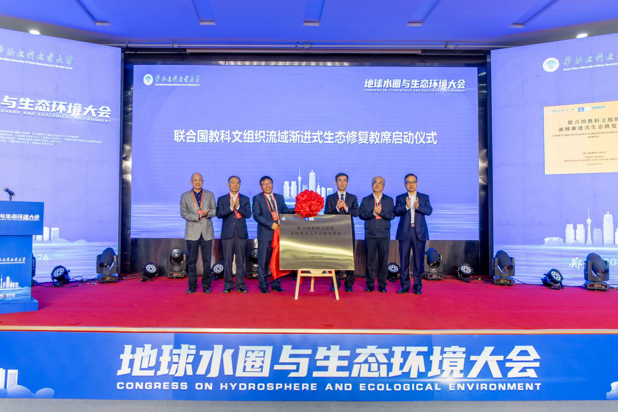 在热烈的掌声中,“联合国教科文组织流域渐进式生态修复教席”正式揭牌。
