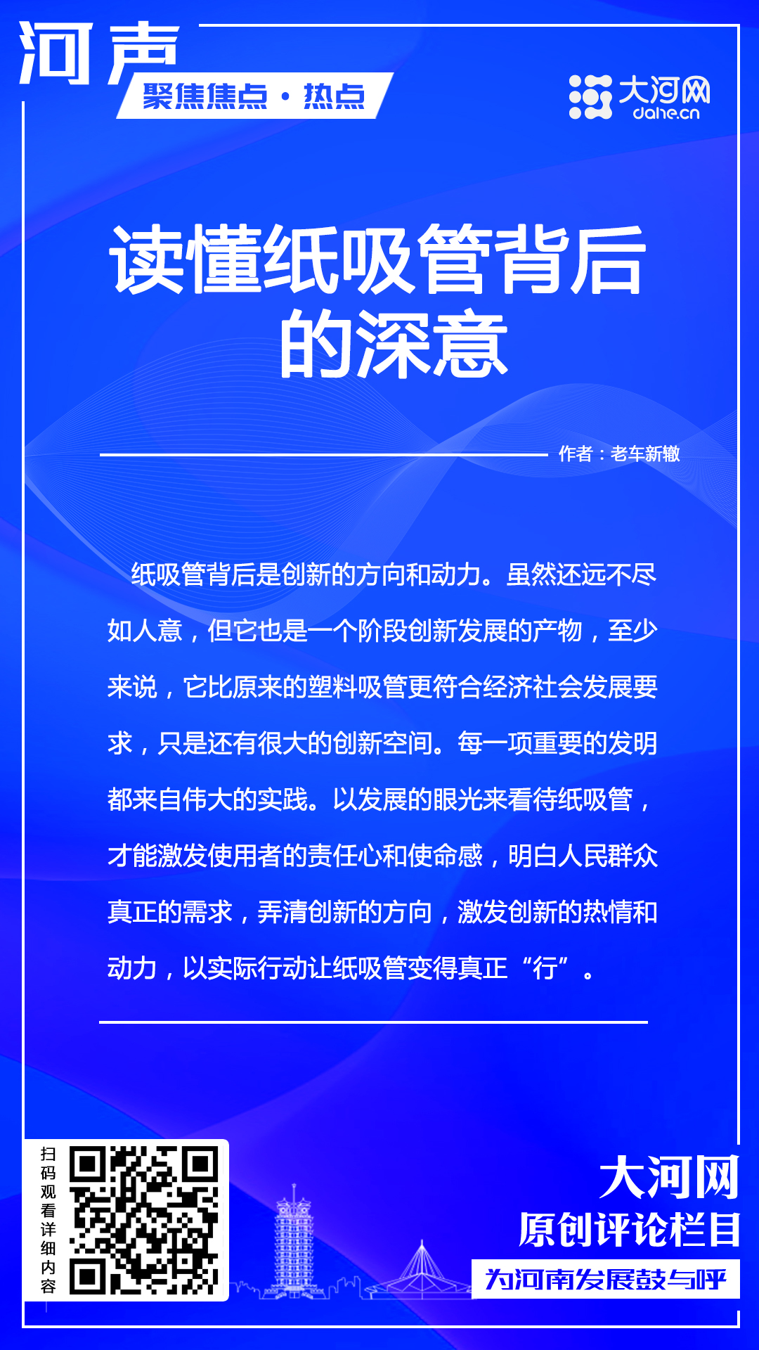 纸吸管背后是创新的方向和动力。创新是一个民族进步的灵魂,是一个国家兴旺发达的不竭动力。纸吸管虽然还远不尽如人意,但它也是一个阶段创新发展的产物,至少来说,它比原来的塑料吸管更符合经济社会发展要求,只是还有很大的创新空间。每一项重要的发明都来自伟大的实践。以发展的眼光来看待纸吸管,才能激发使用者的责任心和使命感,明白人民群众真正的需求,弄清创新的方向,激发创新的热情和动力,以实际行动让纸吸管变得真正“行”。