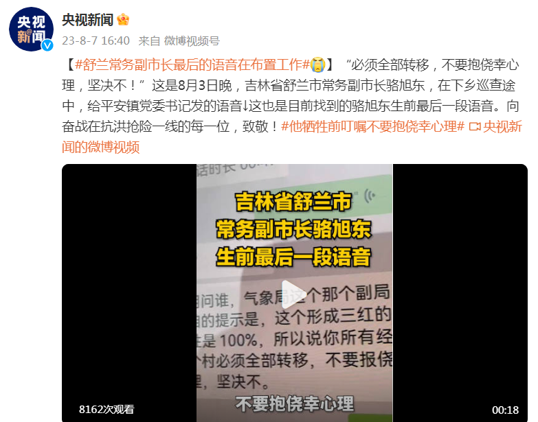 “必须全部转移,不要抱侥幸心理,坚决不!”这是8月3日晚,吉林省舒兰市常务副市长骆旭东在下乡巡查途中给平安镇党委书记发的语音,这也是目前找到的骆旭东生前最后一段语音。向奋战在抗洪抢险一线的每一个人致敬!英雄已去,给我们留下的最后的语音,这是公仆担当的折射,生动诠释了“人民至上”的内涵。