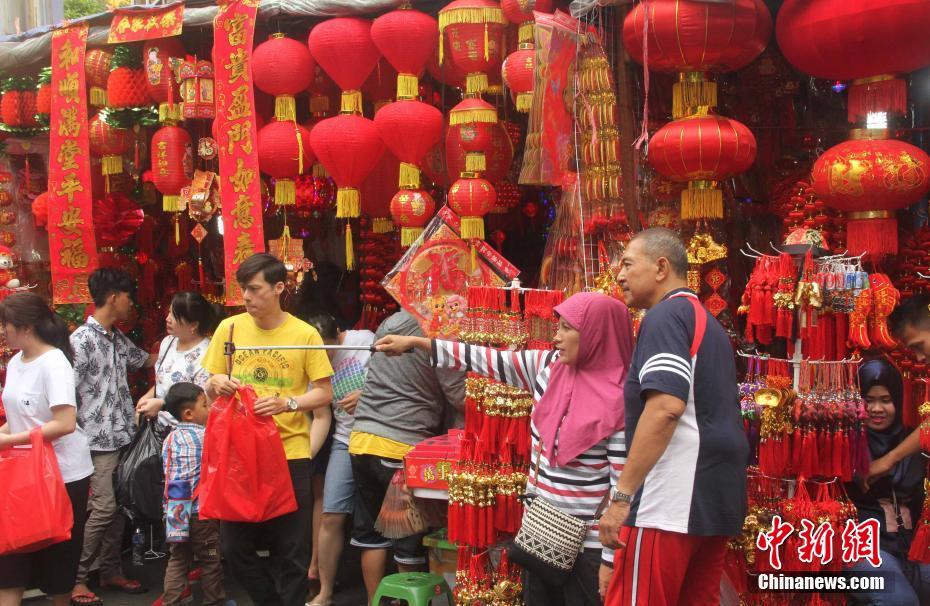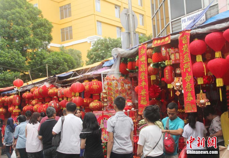 位于雅加达班芝兰草埔的唐人街,临时搭起一条摆卖喜庆用品的“闹热街”。 中新社记者 林永传 摄