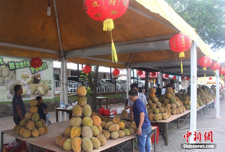 雅加达北区PIK农贸市场外的榴莲摊挂上了大红灯笼。 中新社记者 林永传 摄