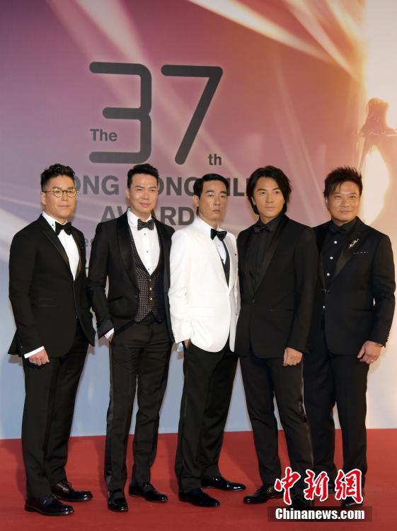 4月15日晚,第37届香港电影金像奖颁奖典礼在香港文化中心大剧院举行。经典电影“古惑仔”演员林晓峰(左起)、谢天华、陈小春、郑伊健、钱嘉乐踏上红地毯。