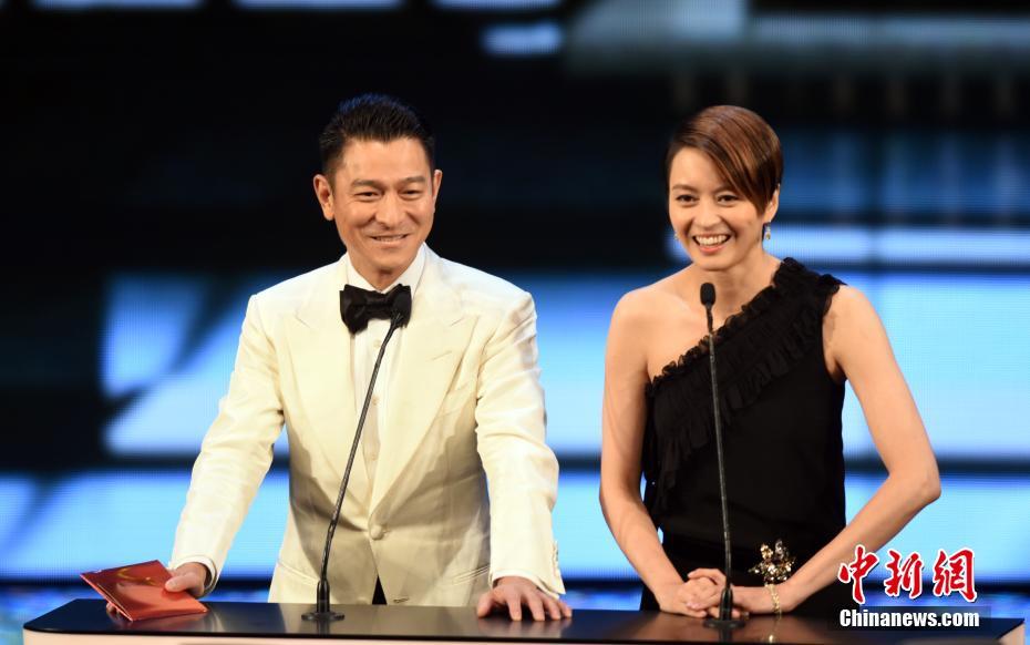 4月15日晚,第37届香港电影金像奖颁奖典礼在香港文化中心大剧院举行,演员刘德华(左)及梁咏琪担任颁奖嘉宾。中新社记者 谭达明 摄