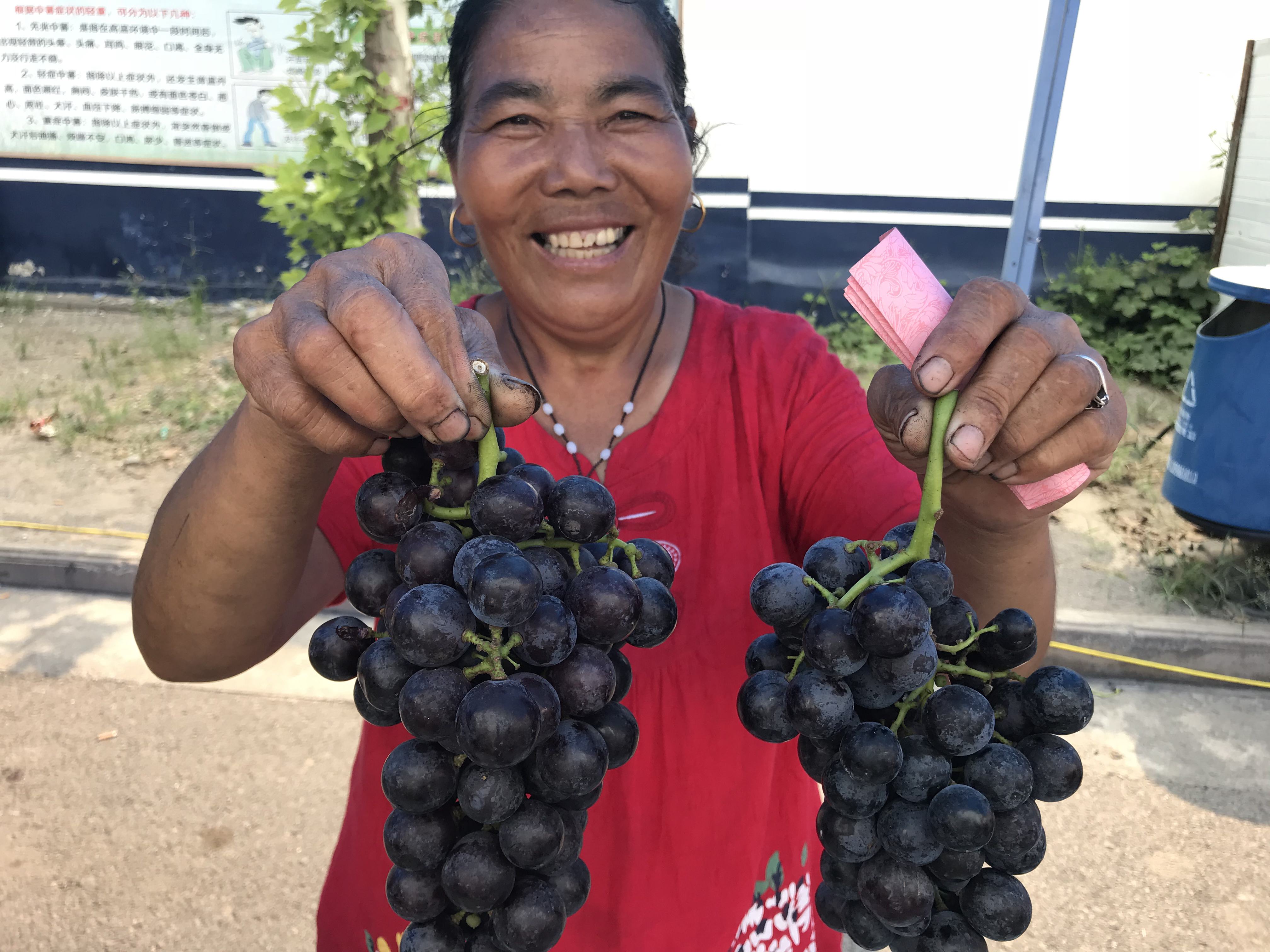 "尝尝这个吧,保证你吃了这回还想下次。"果农于平安热情邀请众人品尝自己种的红芭、黑芭两个品种的葡萄。