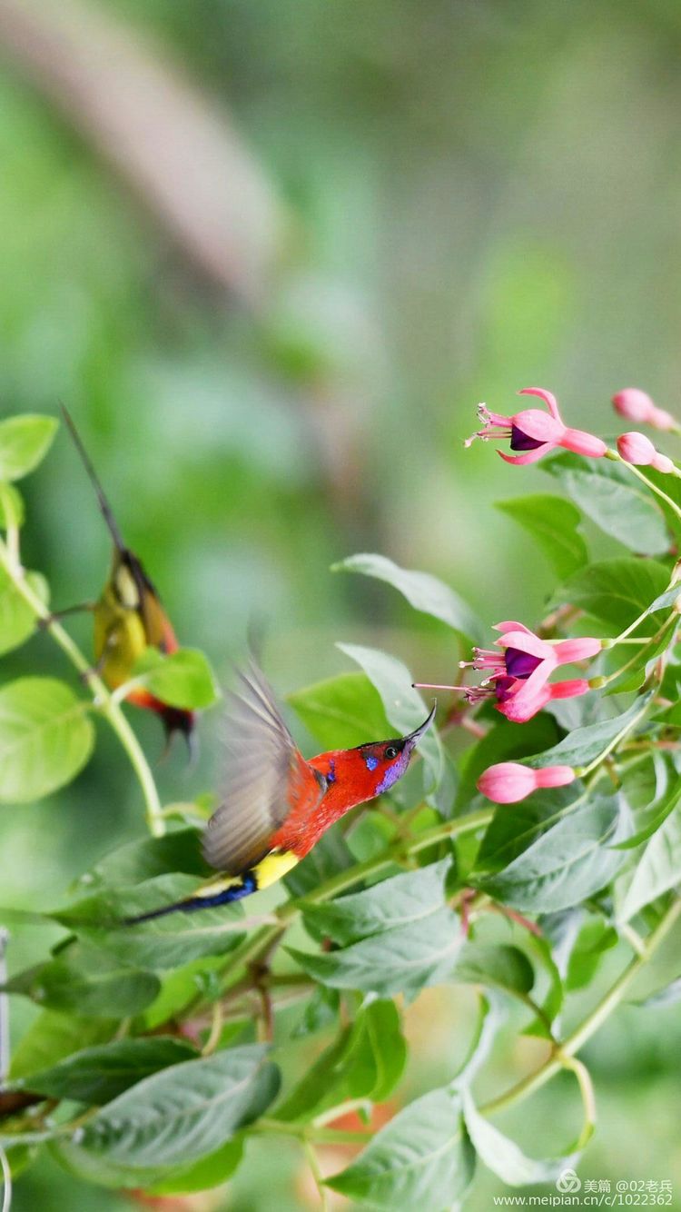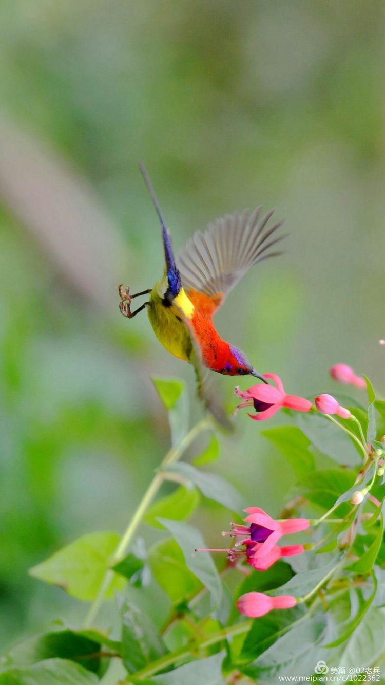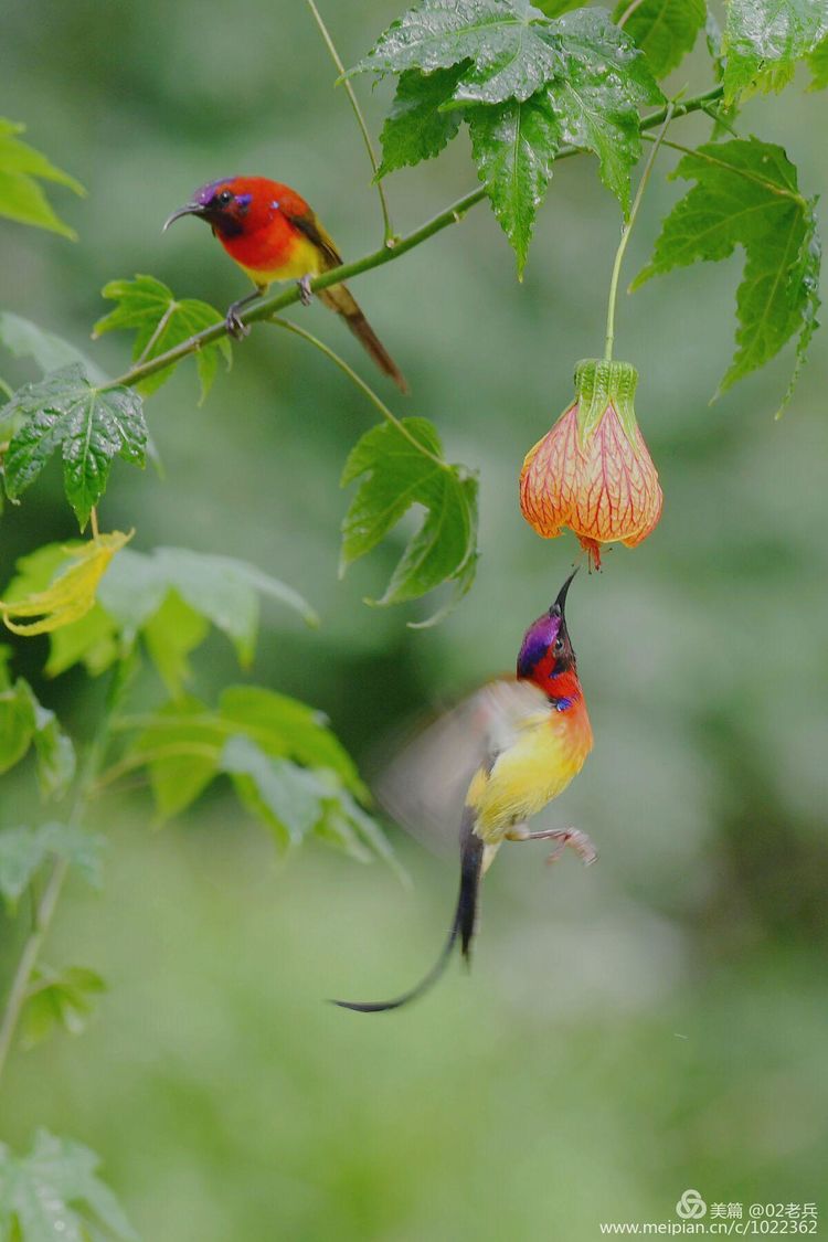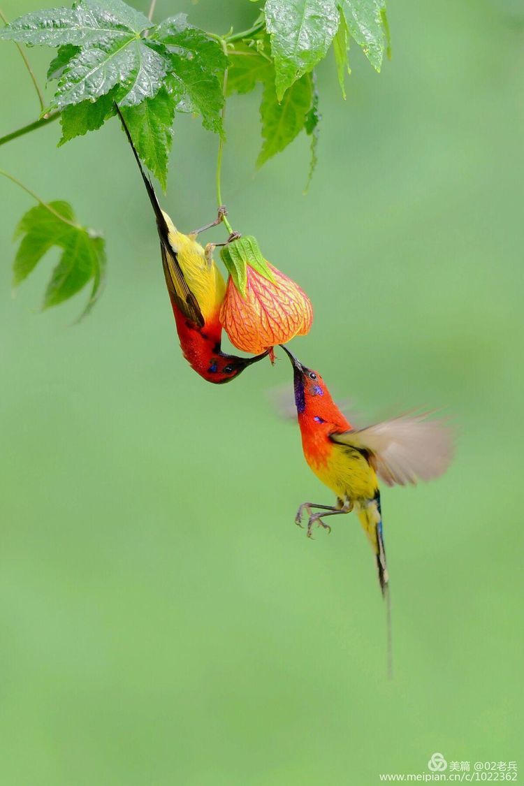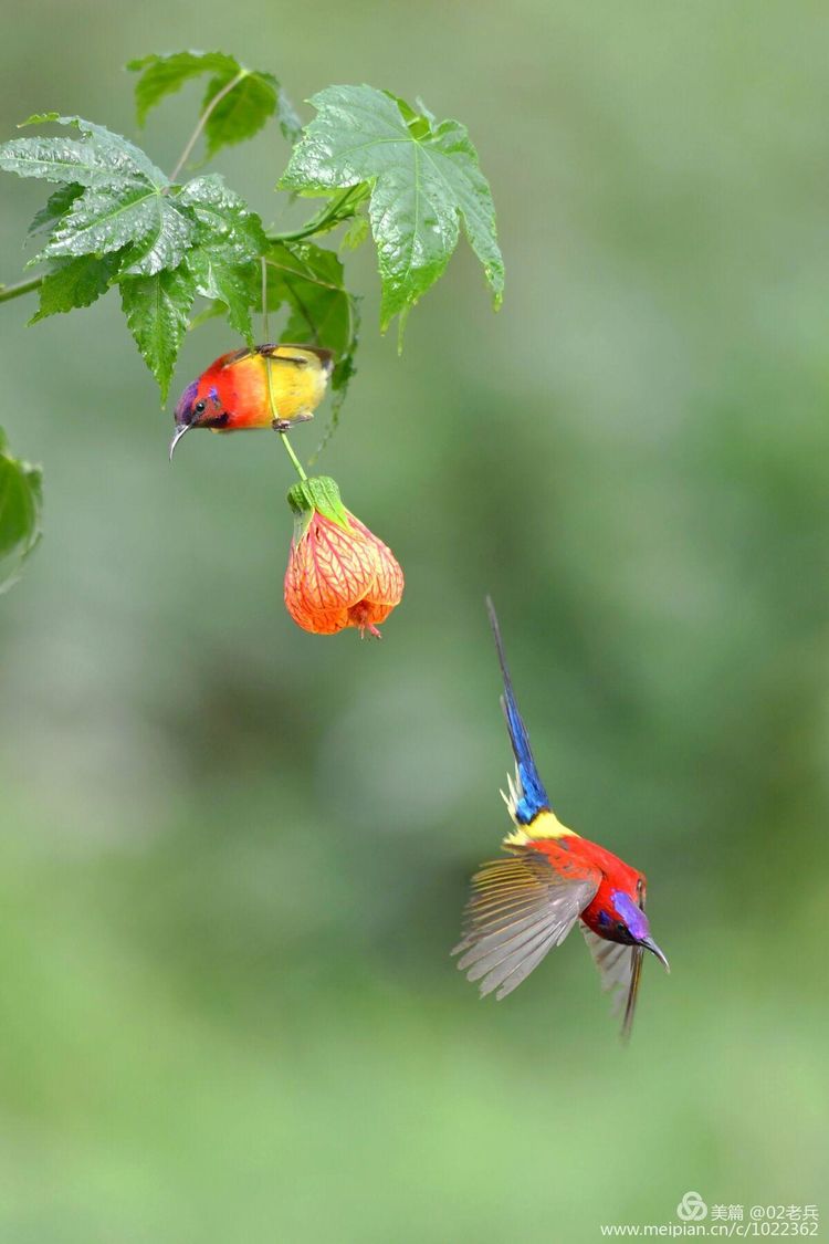 太阳鸟是一种美丽的小鸟,属雀形目、太阳鸟科、太阳鸟属类的通称。体型纤细,嘴细长而下弯,嘴缘先端具细小的锯齿;雄鸟中央尾羽特别长;两性异色。世界共有14种,分布于亚洲南部、菲律宾群岛和印度尼西亚。中国有6种,被誉为"东方的蜂鸟"。