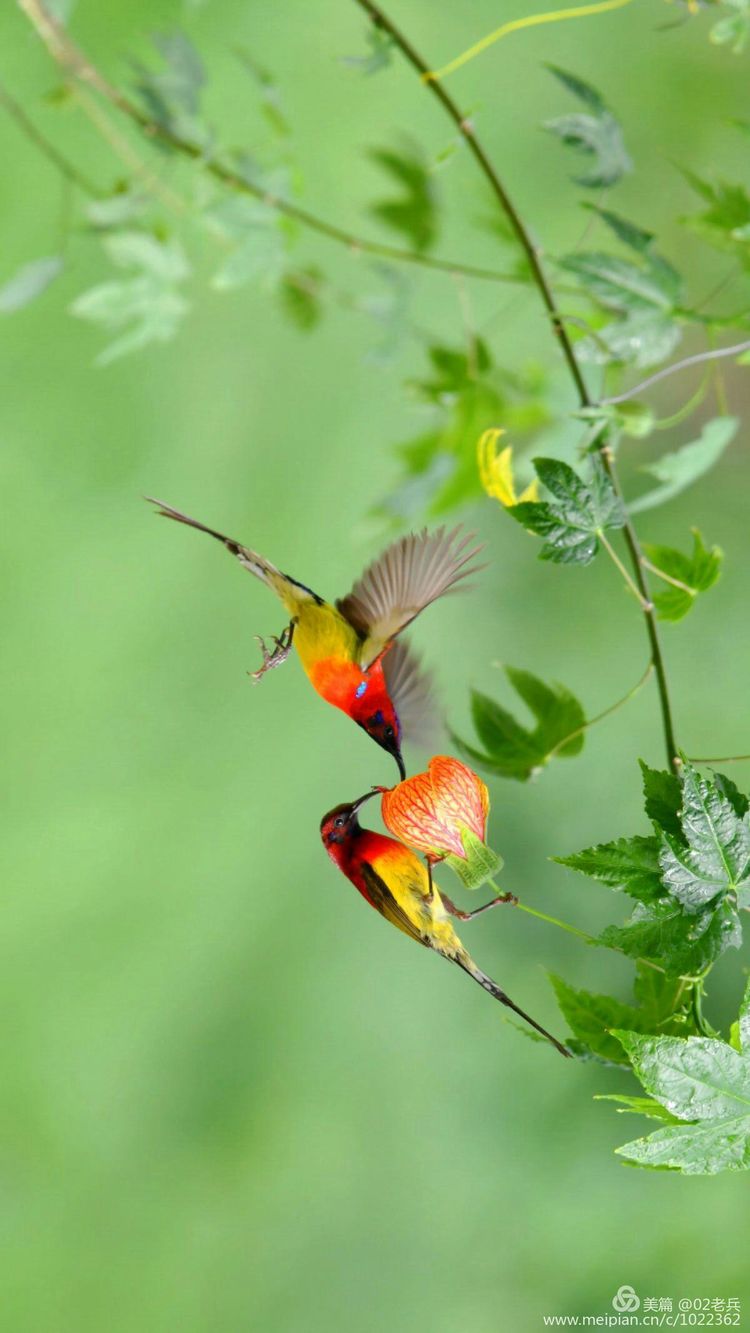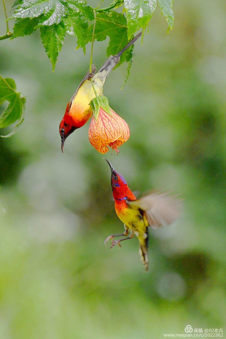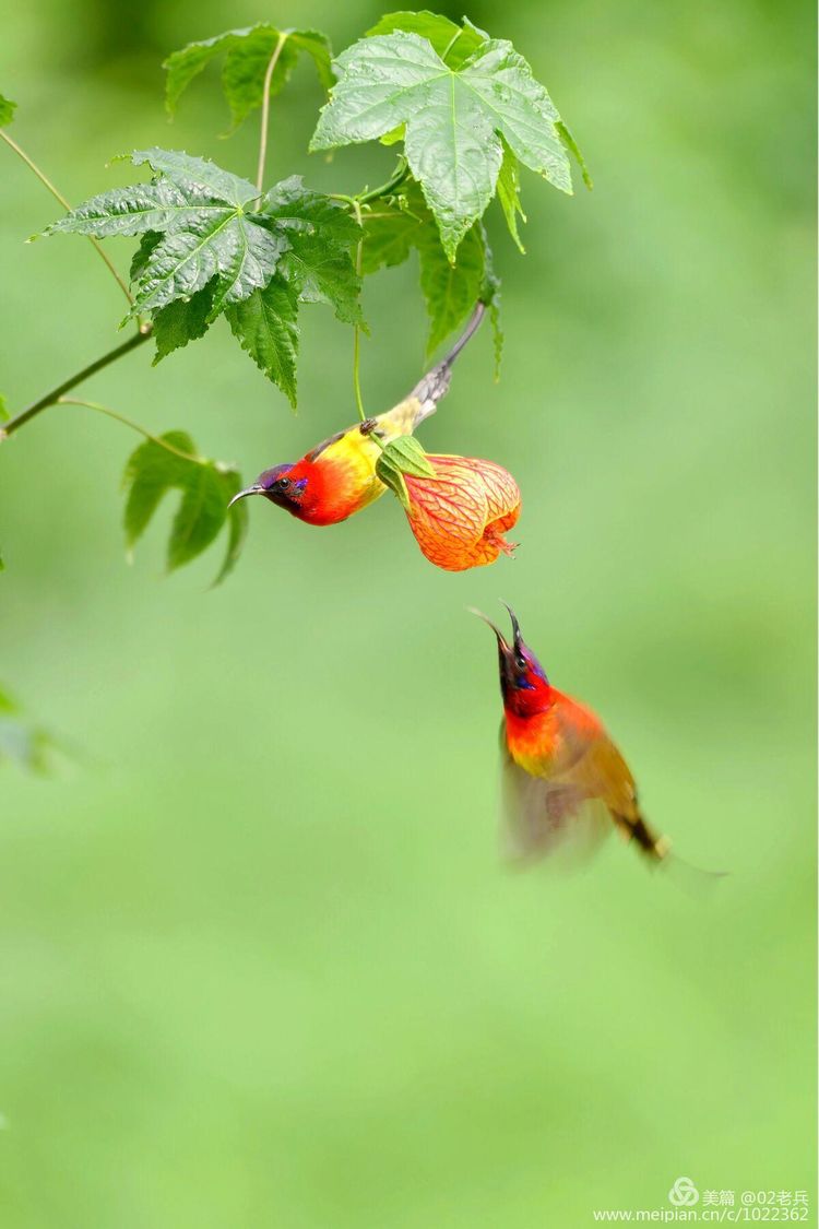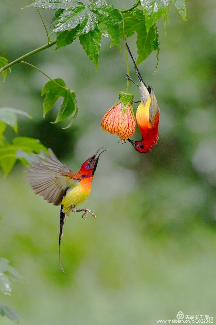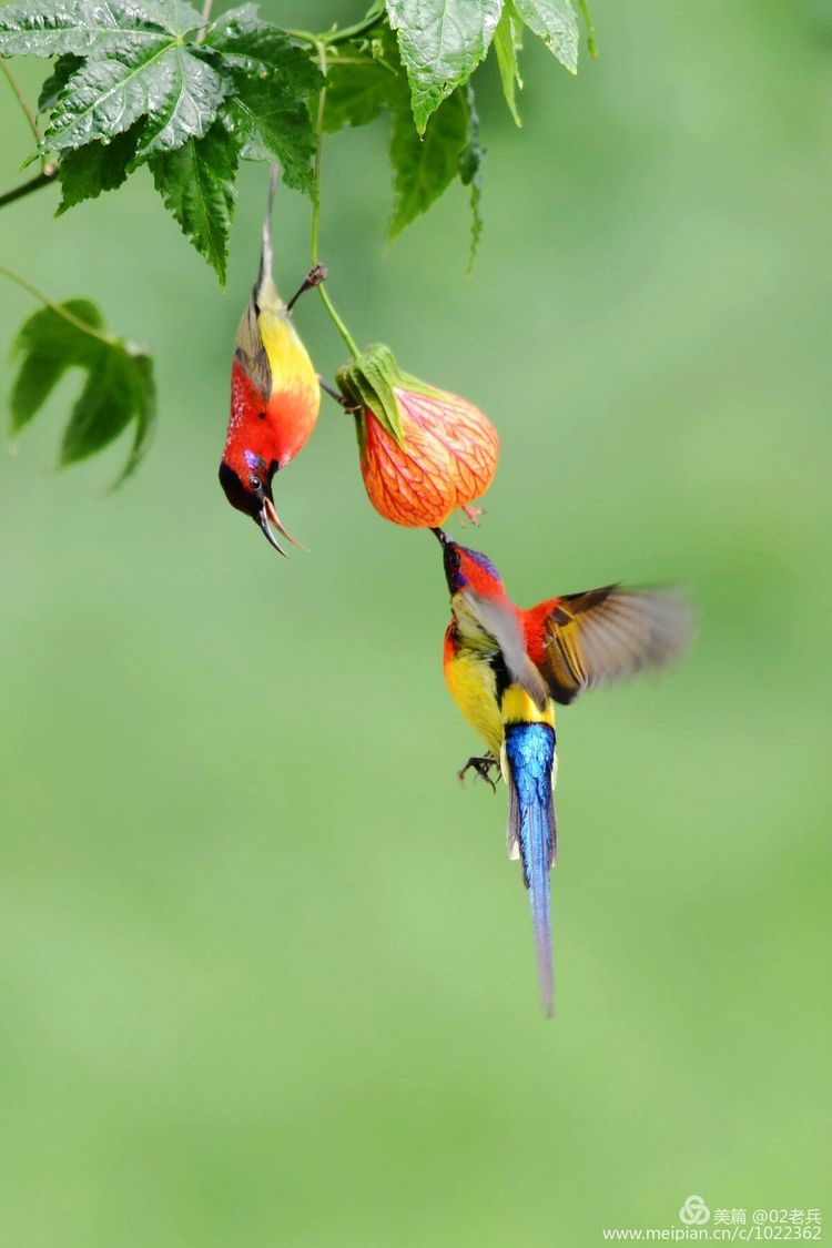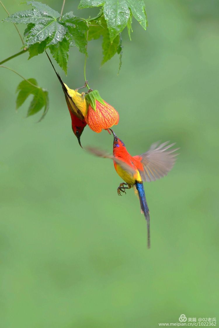 太阳鸟是一种美丽的小鸟,属雀形目、太阳鸟科、太阳鸟属类的通称。体型纤细,嘴细长而下弯,嘴缘先端具细小的锯齿;雄鸟中央尾羽特别长;两性异色。世界共有14种,分布于亚洲南部、菲律宾群岛和印度尼西亚。中国有6种,被誉为"东方的蜂鸟"。