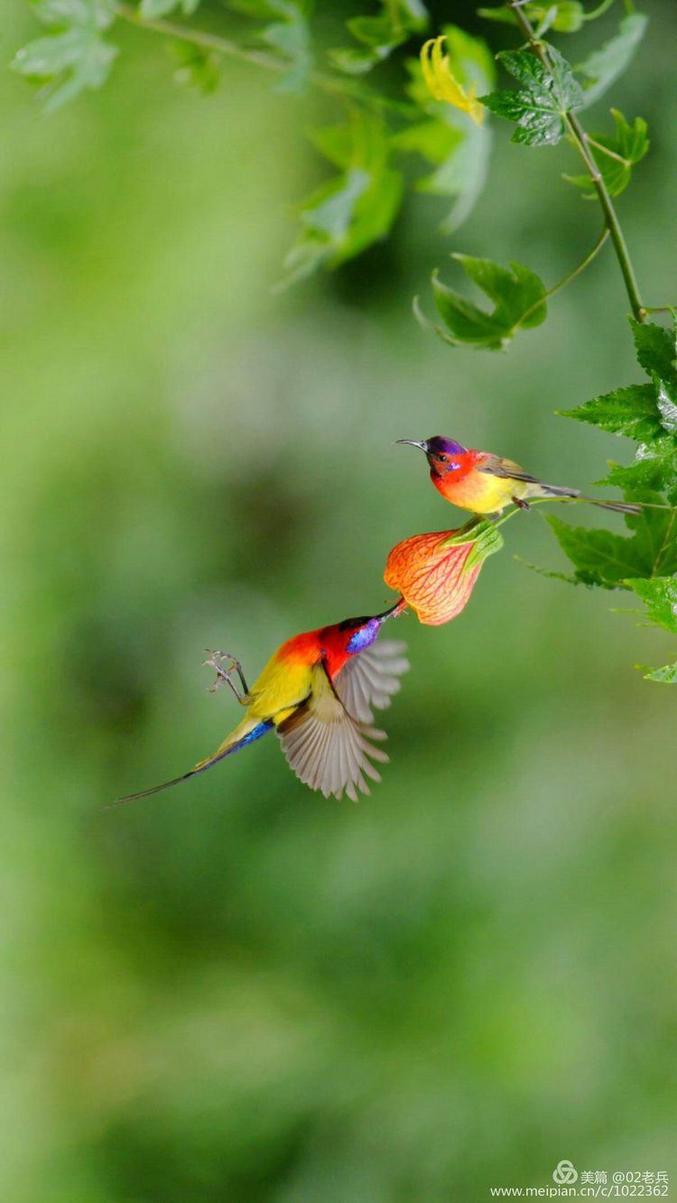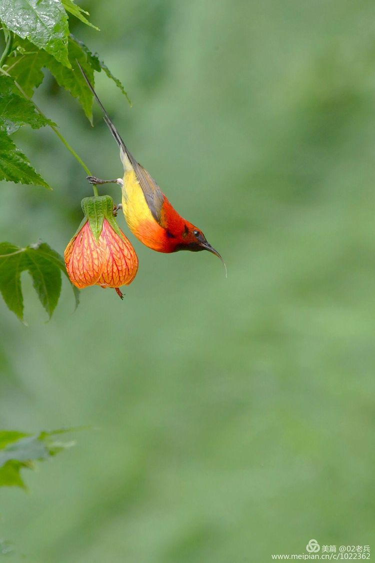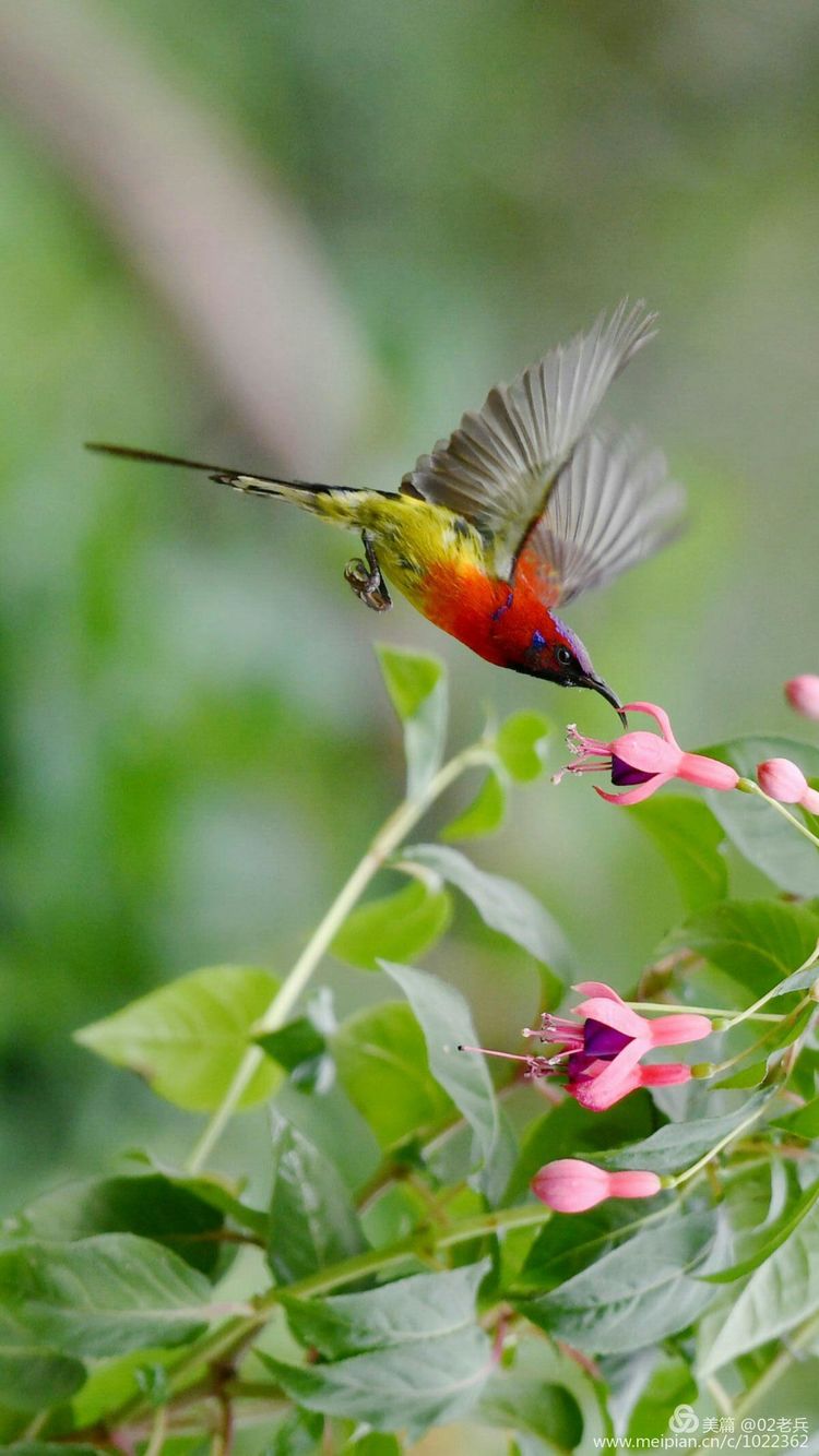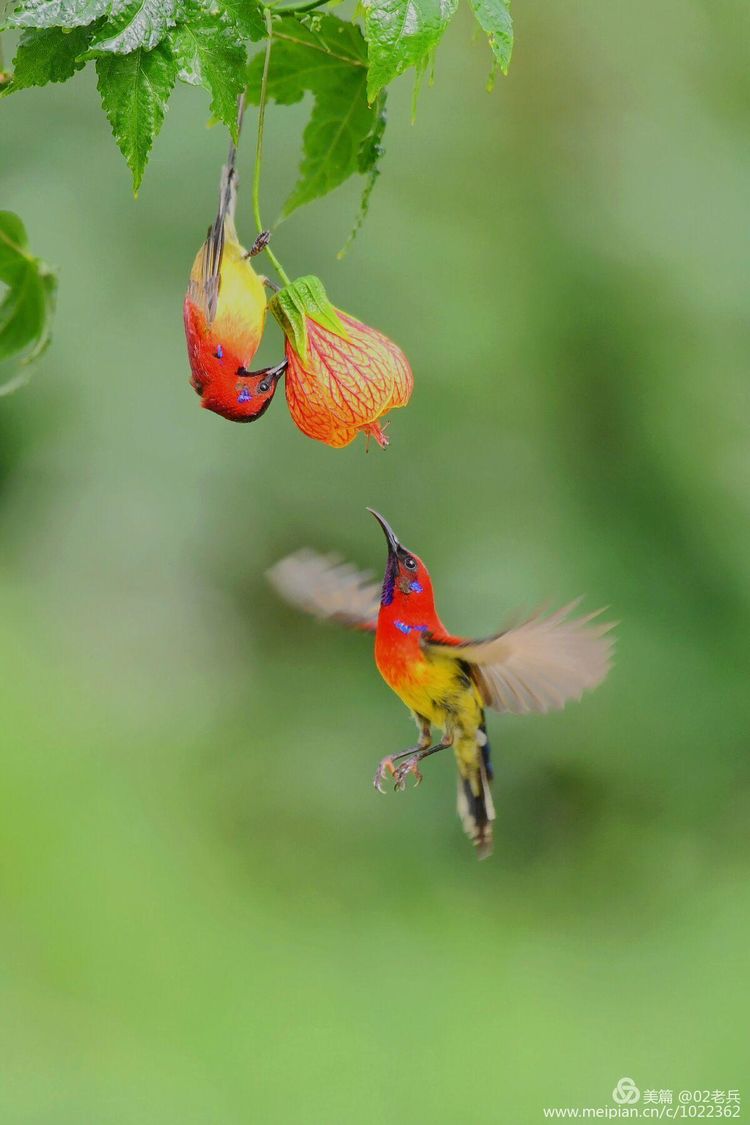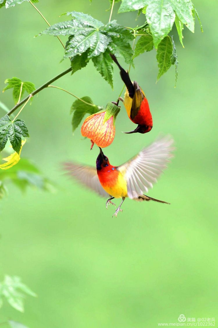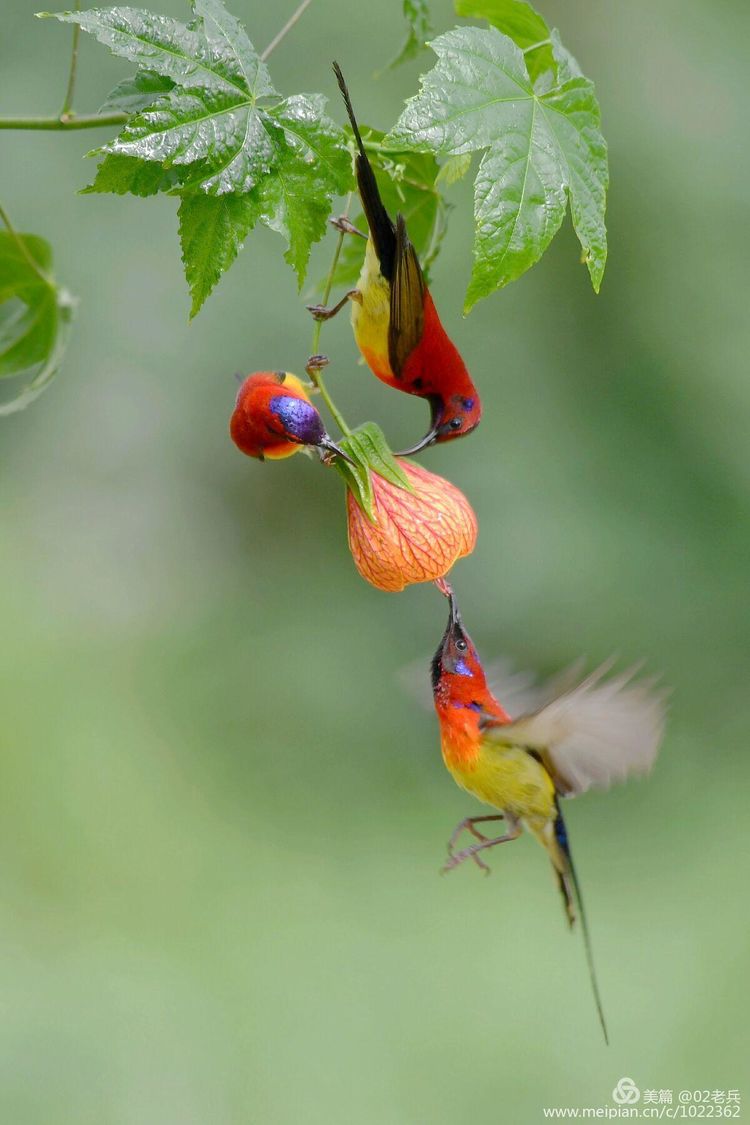 太阳鸟是一种美丽的小鸟,属雀形目、太阳鸟科、太阳鸟属类的通称。体型纤细,嘴细长而下弯,嘴缘先端具细小的锯齿;雄鸟中央尾羽特别长;两性异色。世界共有14种,分布于亚洲南部、菲律宾群岛和印度尼西亚。中国有6种,被誉为"东方的蜂鸟"。