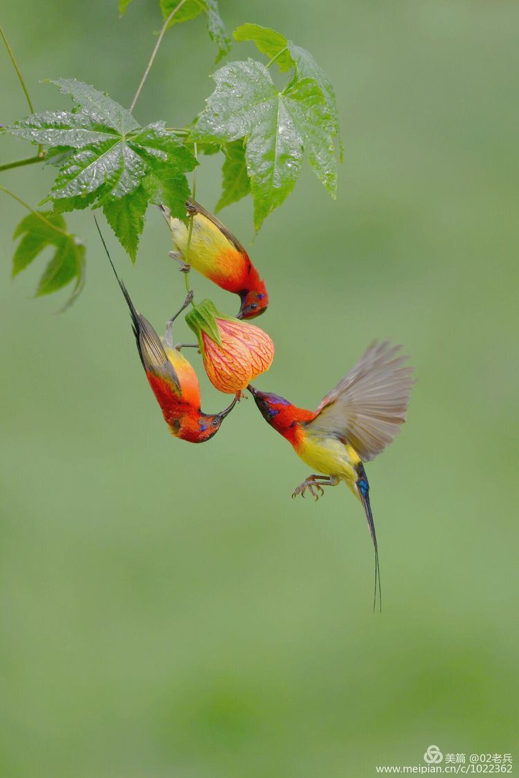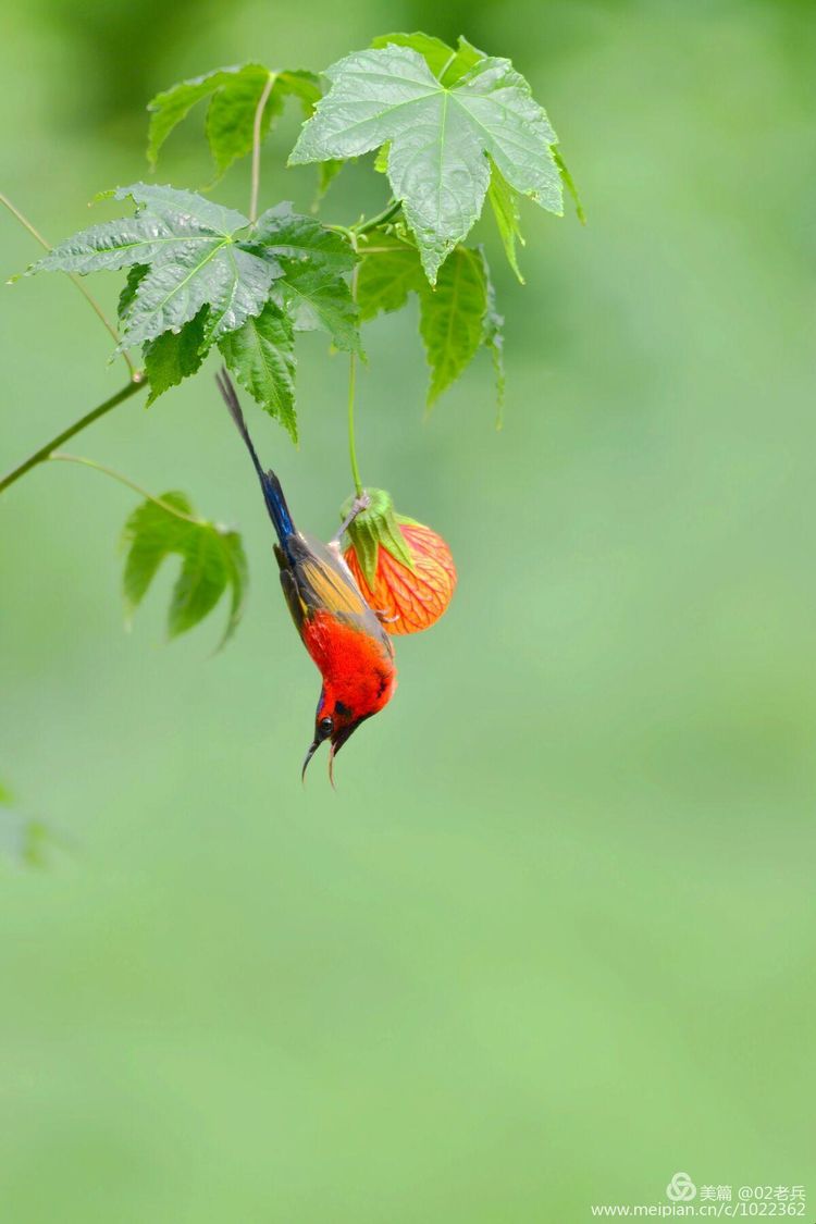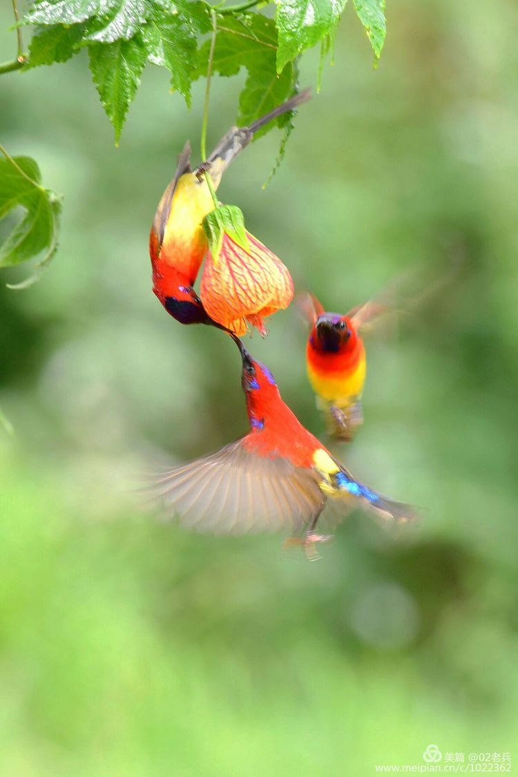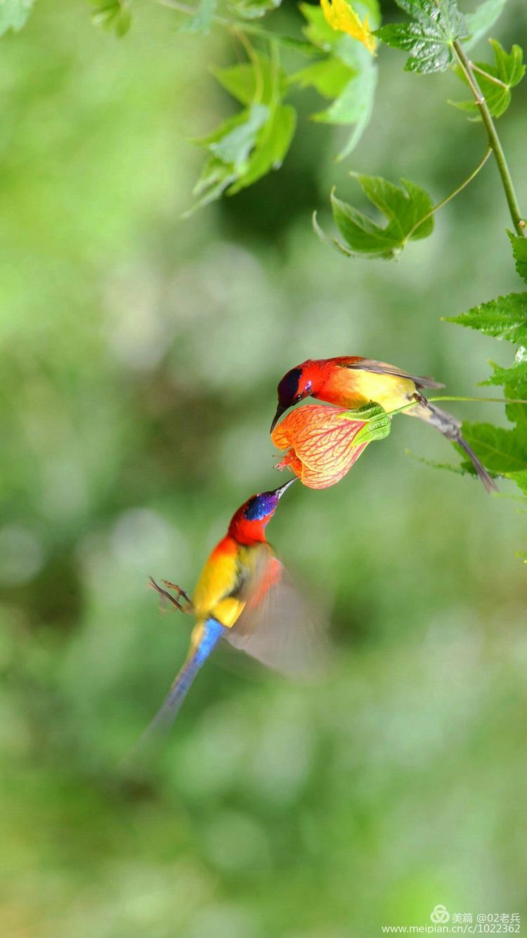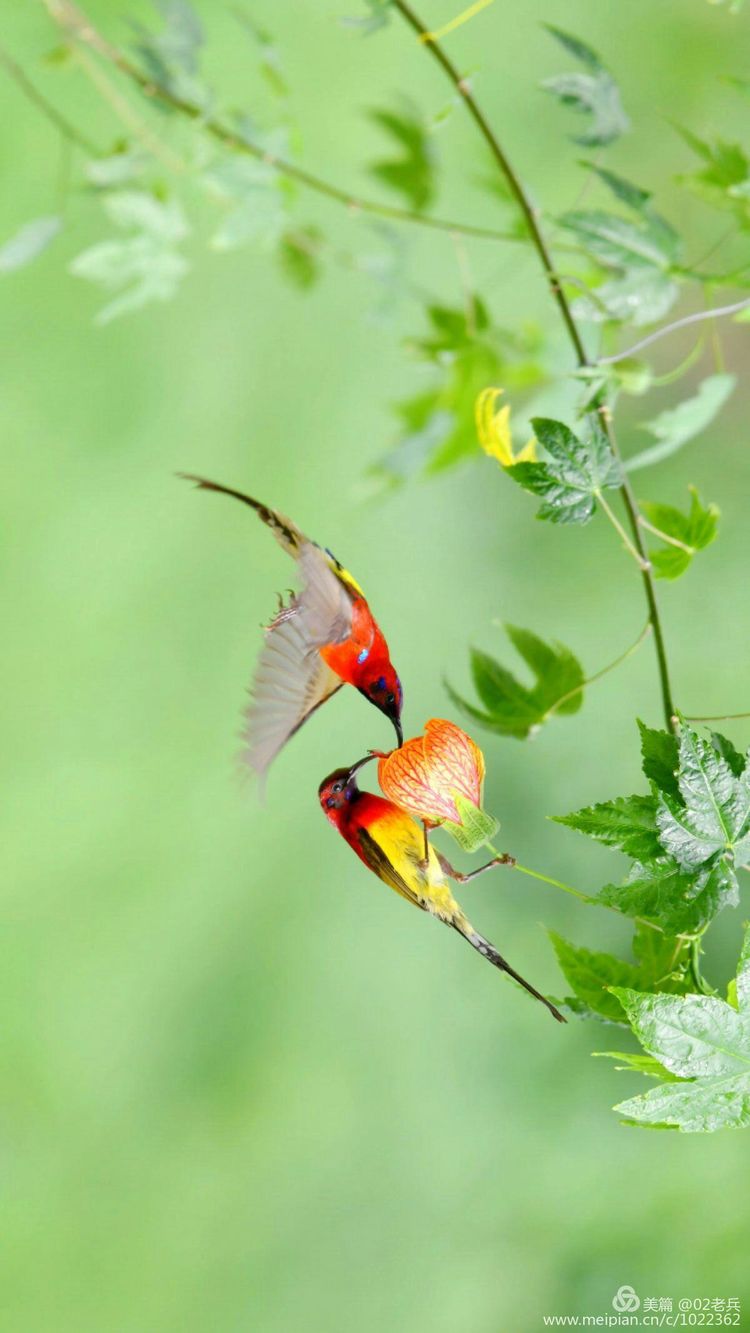 太阳鸟是一种美丽的小鸟,属雀形目、太阳鸟科、太阳鸟属类的通称。体型纤细,嘴细长而下弯,嘴缘先端具细小的锯齿;雄鸟中央尾羽特别长;两性异色。世界共有14种,分布于亚洲南部、菲律宾群岛和印度尼西亚。中国有6种,被誉为"东方的蜂鸟"。
