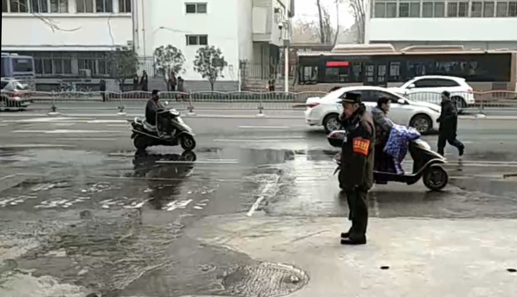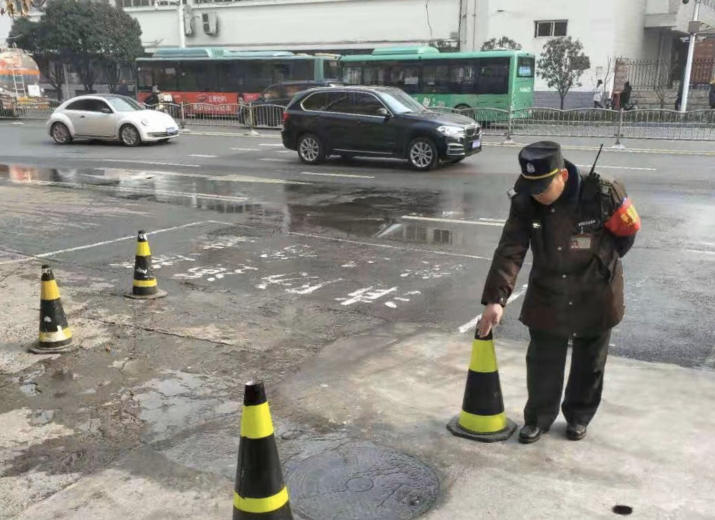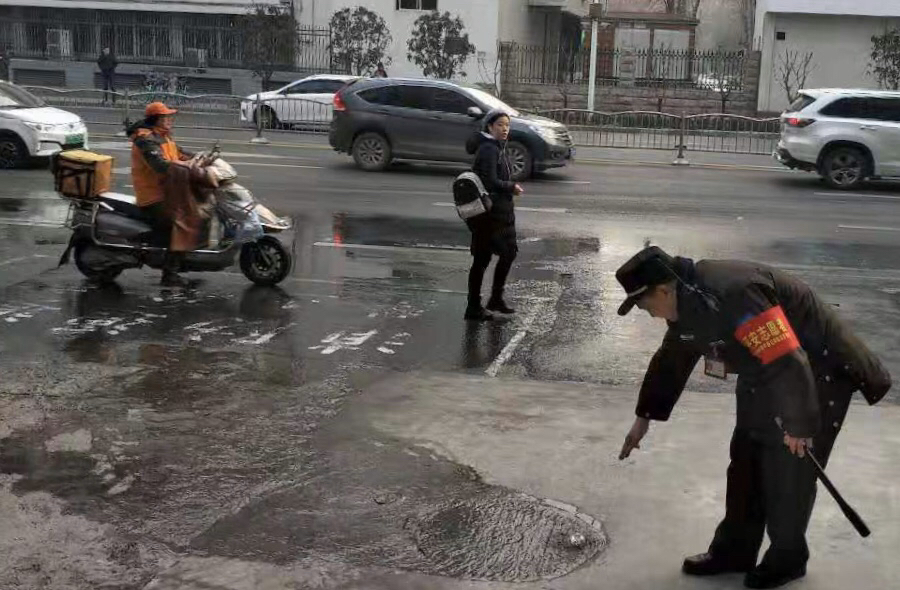 10月14日,在郑州市中原区桐柏路与中原路交叉口北约50米处,快车道中间的一口窨井不断向外冒出大量的污水,导致路面结冰,不时有行人滑倒,险情不断。在路上巡逻的巡防队员见状,忙在窨井周边摆上反光锥,并指挥行人和车辆绕行。