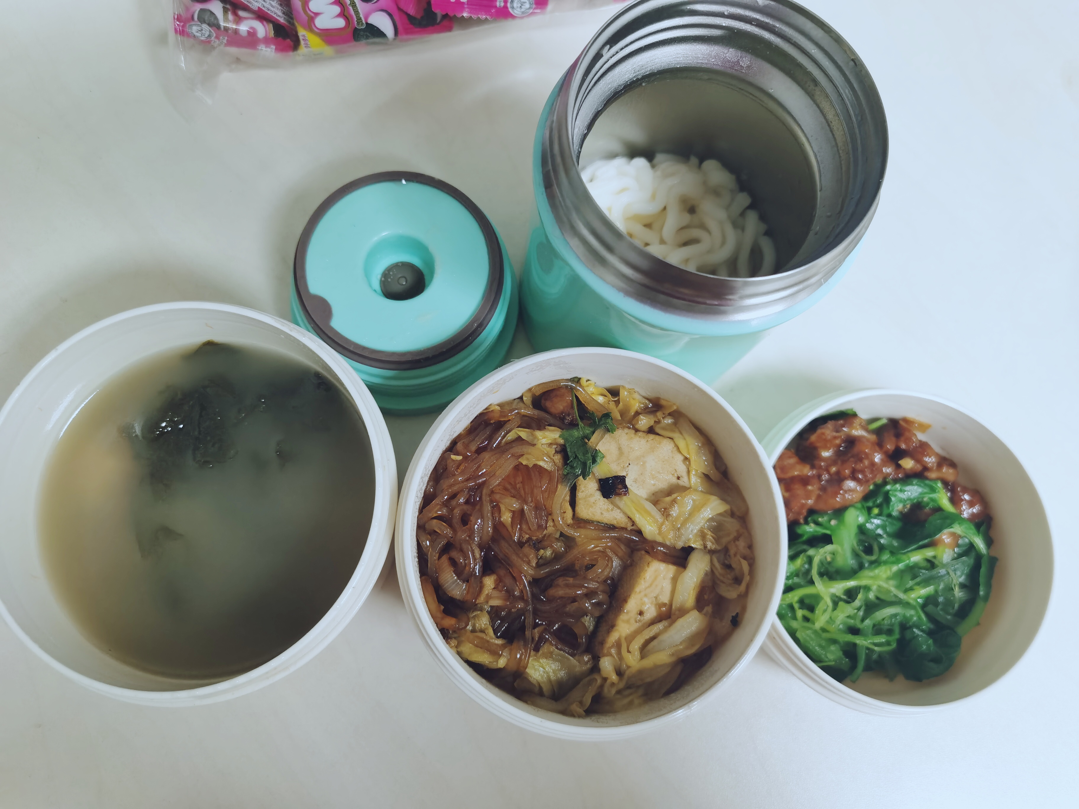 “这是我老公给我做的爱心餐,红烧鸡块、焯青菜、大烩菜和一个‘被加料’的海米紫菜汤!主食的话,我用焖烧杯焖了个面。”3月17日中午,在金水区农业路一公司上班的张女士向记者展示了她的午餐。只见一个个可爱的便携小碗中整齐地摆放着菜品,一个深10多厘米的汤碗中盛着热腾腾的汤。