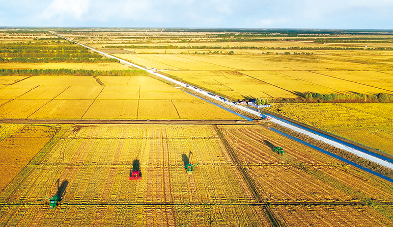 中国人要把饭碗端在自己手里,而且要装自己的粮食。改革开放40多年来,我国农业农村现代化建设取得重要进展,农业物质技术装备水平不断提高,确保粮食安全的基础更加牢固。黑龙江是我国粮食生产大省,2018年粮食产量超过1500亿斤,实现“十五连丰”。图为无人机航拍的大型农机在黑龙江省三江平原一处稻田收割水稻。 新华社记者 王建威/摄