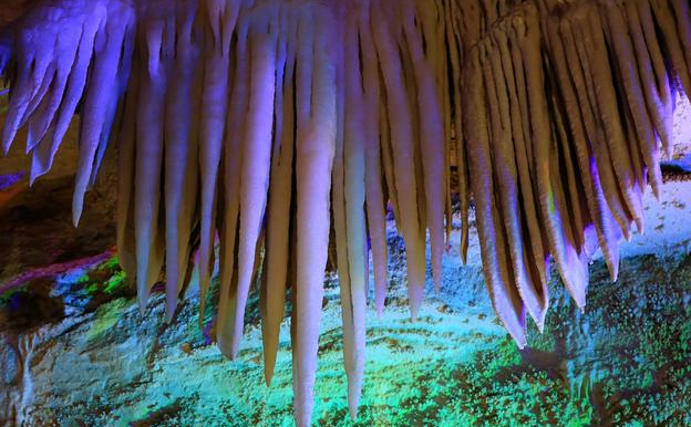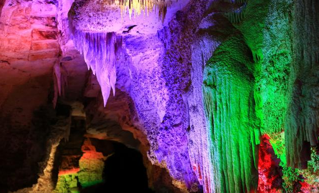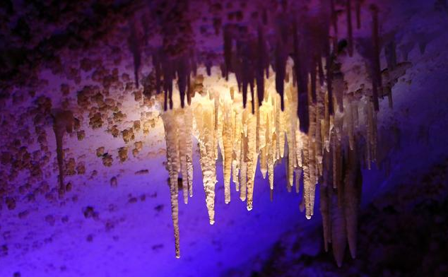 踏进雪花洞,一股凉爽的气流顿时袭来,和户外三十七八度的高温形成鲜明对比,如果要长时间呆在下面,估计会感觉有点冷。在七彩灯光的照射下,犹如进入一个梦幻般的世界,喀斯特地质奇观呈现眼前,形态各异的沉积物造型,有的如冰瀑,有的如冰柱,面对如此奇妙的地下世界,不仅感叹大自然的鬼斧神工。